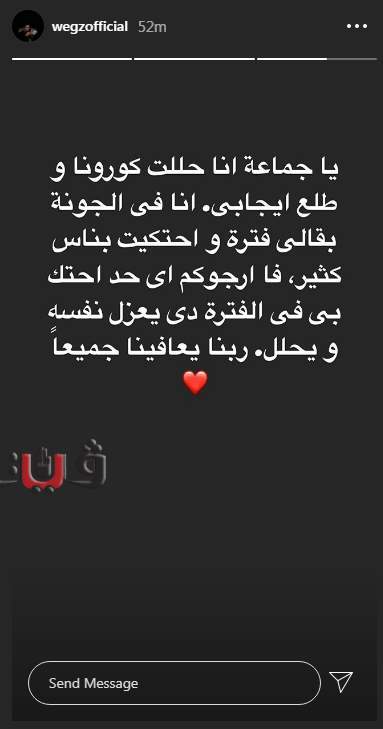 وأوضح ويجز عبر خاصية “الاستوري” بحسابه الشخصي بموقع الصور والفيديوهات القصيرة “انستجرام”، وقال: “يا جماعة أنا حللت كورونا وطلع إيجابي، أنا في الجونة بقالي فترة واحتكيت بناس كتير، فأرجوكم أي حد احتك بيا في الفترة دي يعزل نفسه ويحلل.. ربنا يعافينا كلنا”.