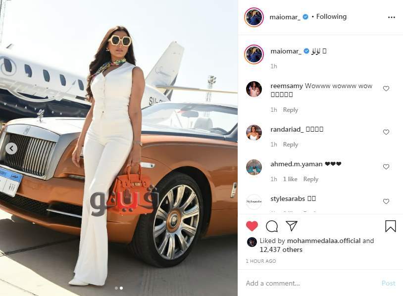 ونشرت مي صورتين عبر حسابها الرسمي بـ”انستجرام” ظهرت فيها بـ”جامبسوت” بيضاء اللون، وخلفها سيارة رولز رايس، وطائرة.