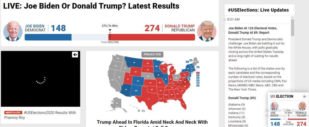 وأظهر الموقع خلال الخريطة الانتخابية للولايات الأمريكية، اجتياز ترامب حاجز الـ270 صوتاً المطلوبة لحسم المعركة الانتخابية، بالرغم من استمرار عمليات فرز الأصوات حتى الآن، والتي جاءت بحوالي 274 صوتاً مقابل 148 صوتا لصالح المرشح الديمقراطي، جو بايدن، نائب الرئيس الأمريكي باراك أوباما.