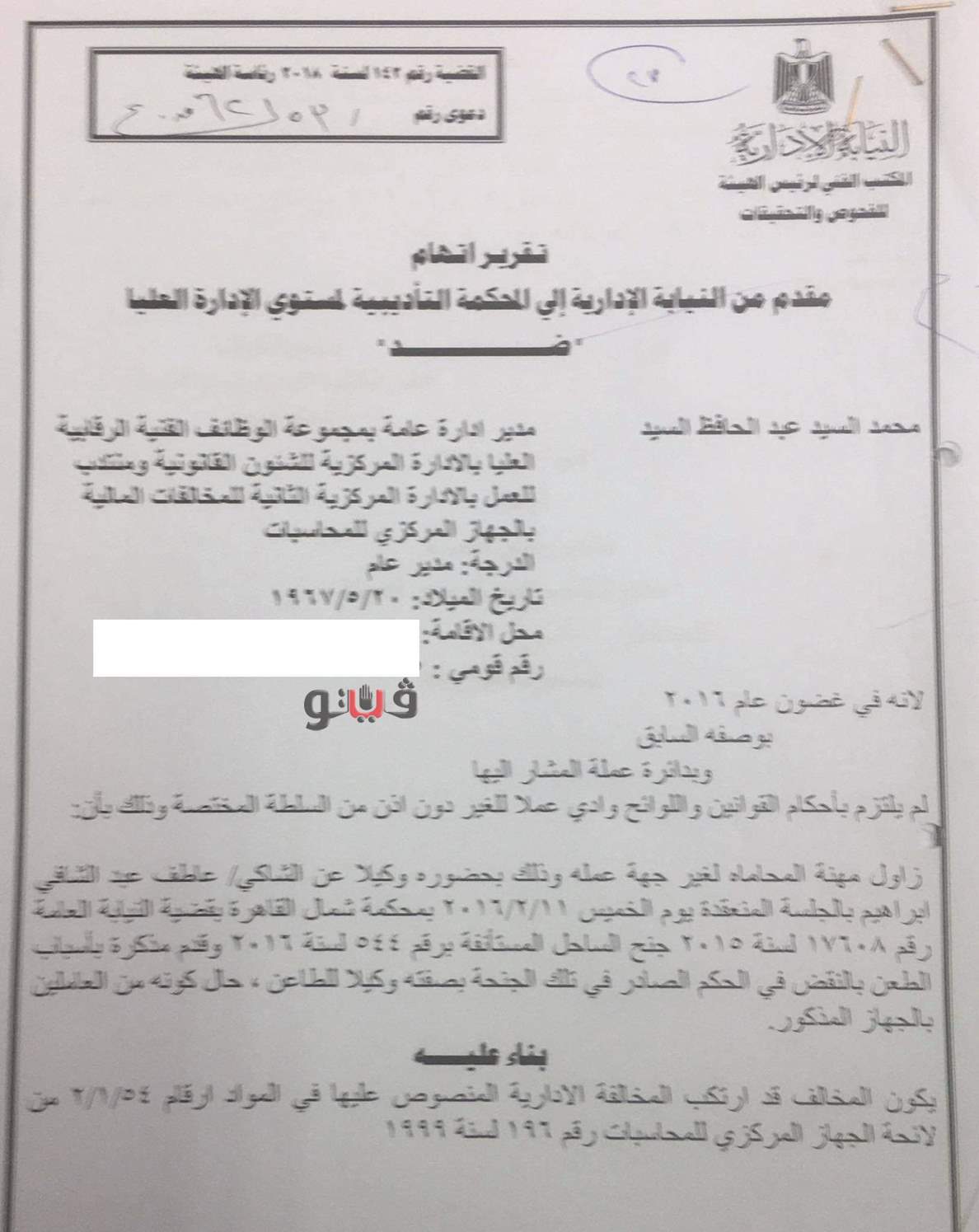 إحالة مدير عام بـ"المركزي للمحاسبات" إلى المحاكمة لمزاولته مهنة المحاماة