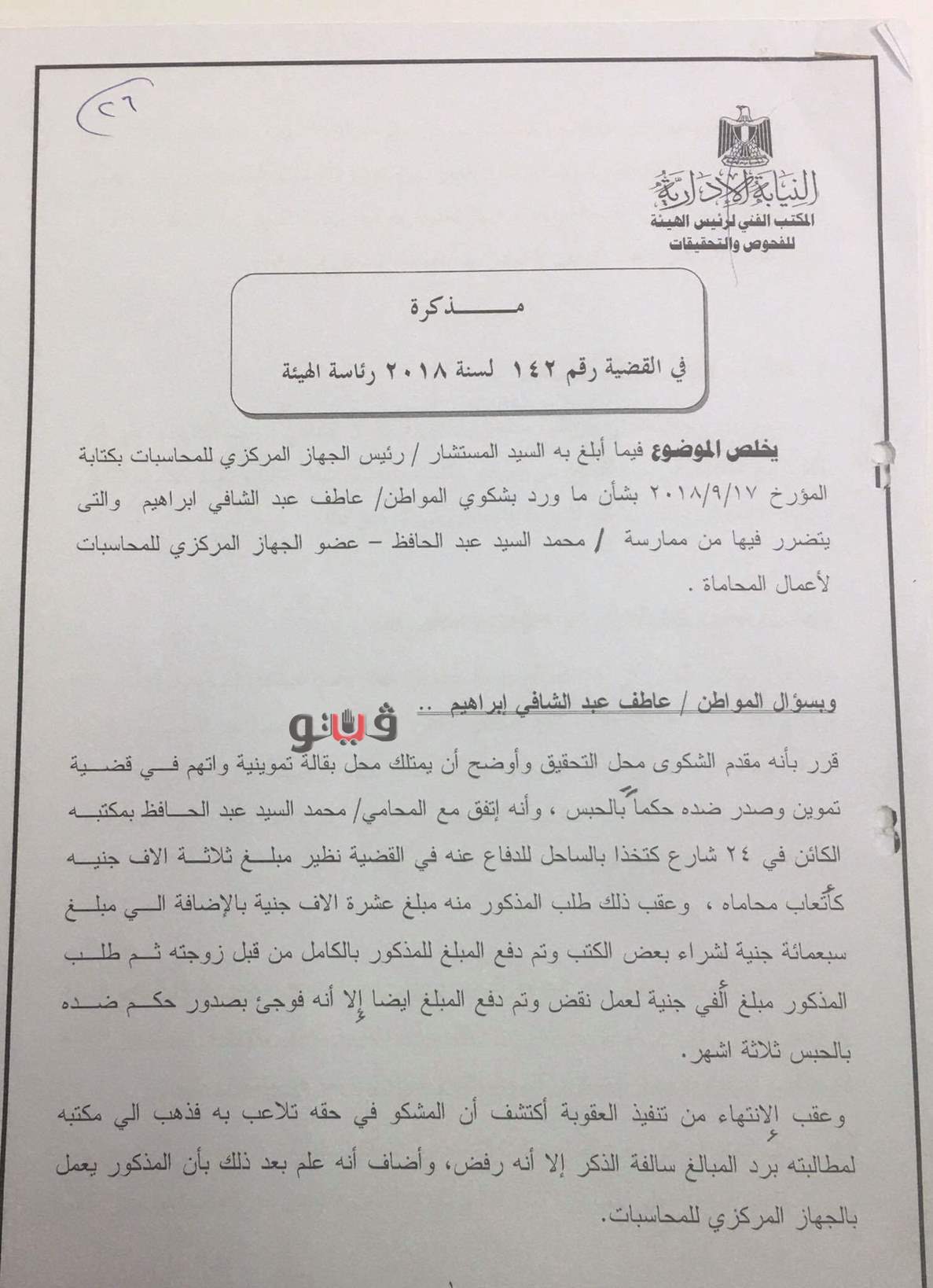 وكان رئيس هيئة النيابة الإدارية تلقى بلاغًا من رئيس الجهاز المركزي للمحاسبات بشأن شكوى المواطن عاطف عبد الشافي ابراهيم يتضرر فيها من ممارسة المحال لأعمال المحاماة رغم كونه عضوًا بالجهاز.