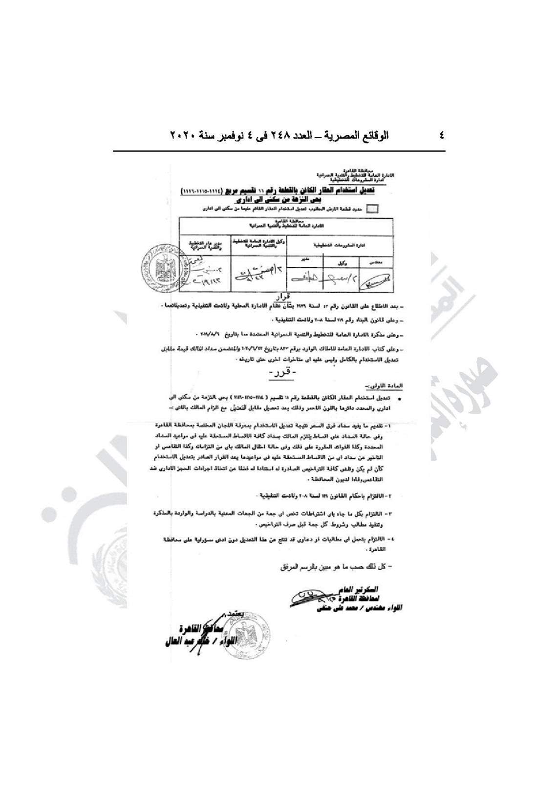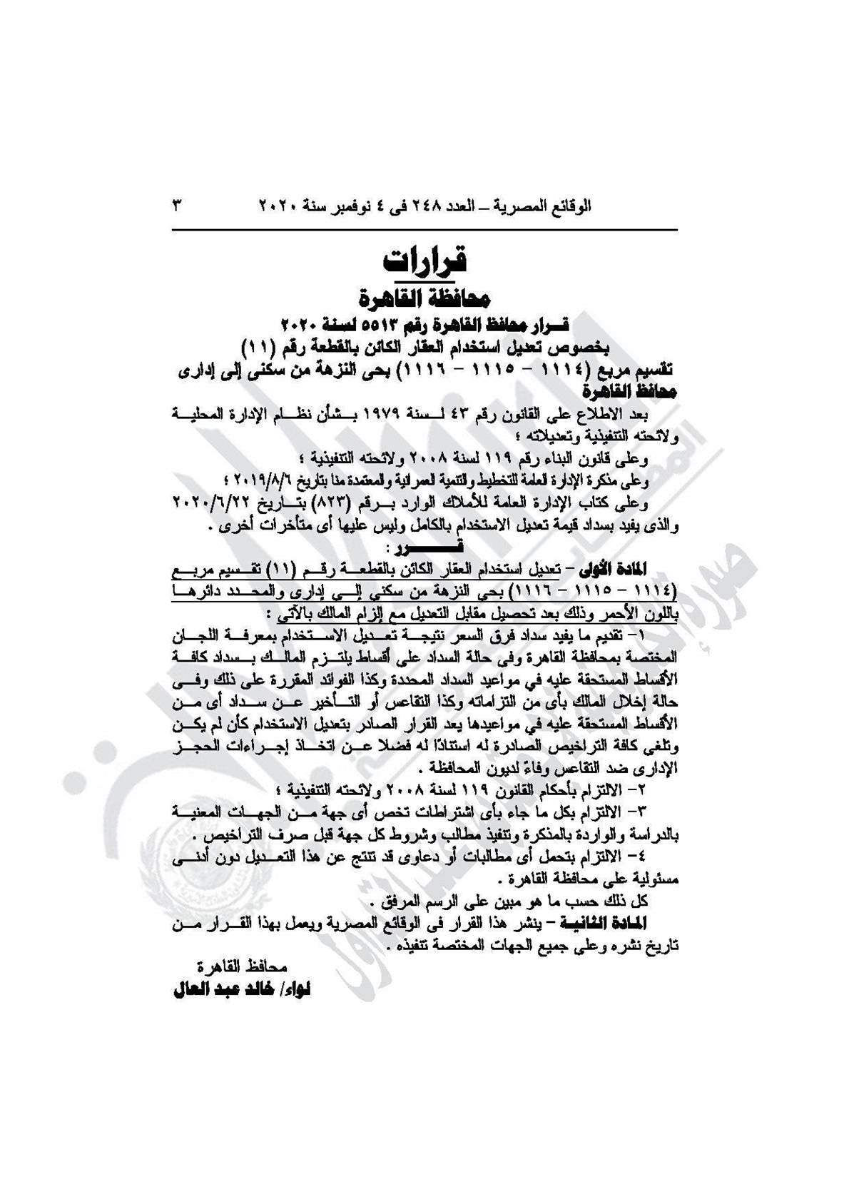 نشرت جريدة الوقائع المصرية في عددها رقم 248، الصادر في 4 نوفمبر 2020، قرار محافظة القاهرة رقم 5513 لسنة 2020، بخصوص تعديل استخدام العقار الكائن بالقطعة رقم (11) بحي النزهة من سكنى إلى إداري.