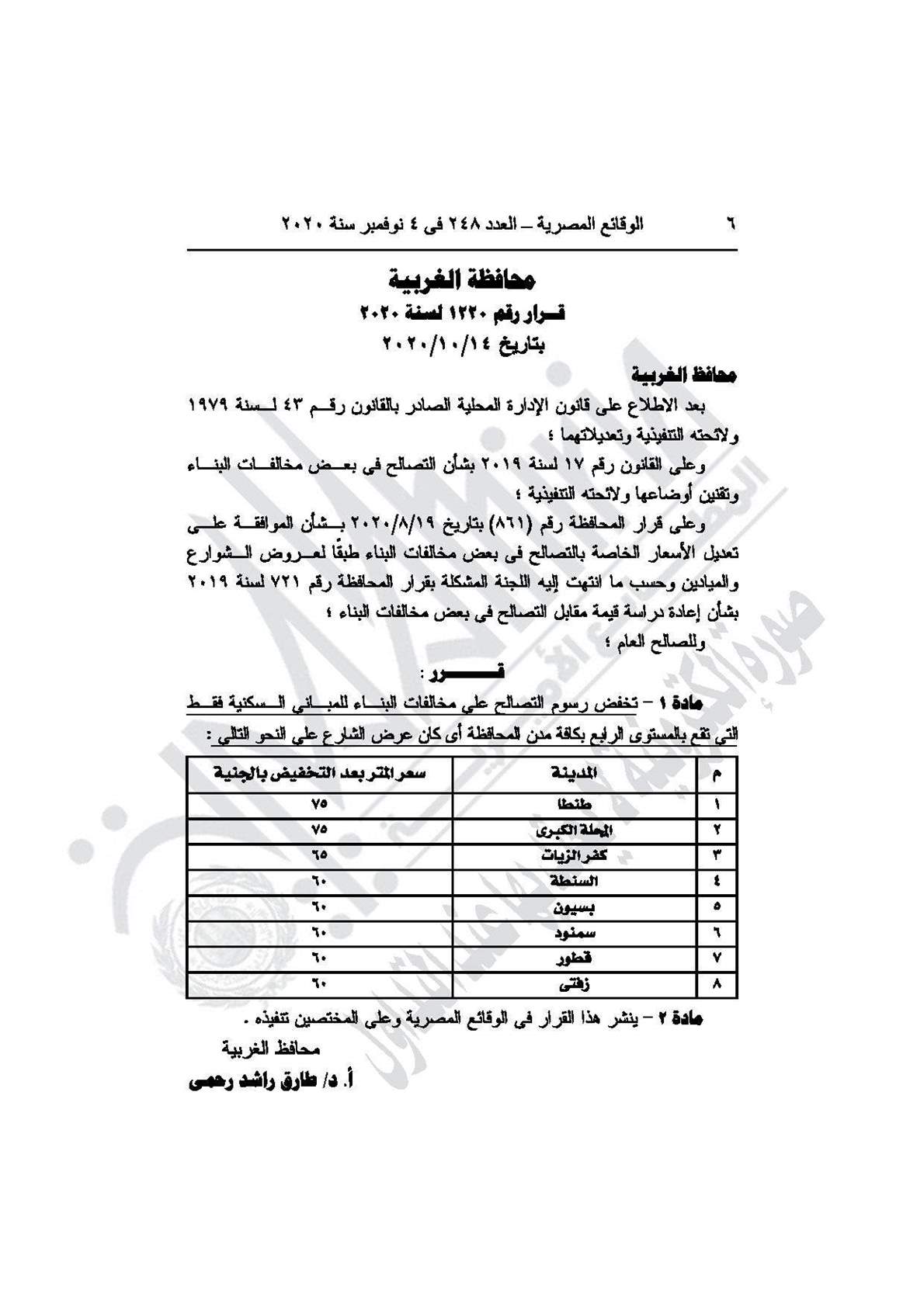 نشرت جريدة الوقائع المصرية في عددها رقم 248، الصادر في 4 نوفمبر 2020، قرار محافظة الغربية رقم 1220 لسنة 2020، تخفيض رسوم التصالح في مخالفات البناء للمباني السكنية فقط بكافة مدن المحافظة.