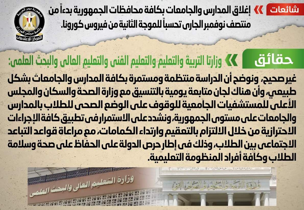 نفى المركز الاعلامي بمجلس الوزراء ما تداولته بعض المواقع الإلكترونية وصفحات التواصل الاجتماعي من أنباء حول إغلاق المدارس والجامعات بكافة محافظات الجمهورية بدءاً من منتصف نوفمبر الجاري تحسباً للموجة الثانية من فيروس كورونا.