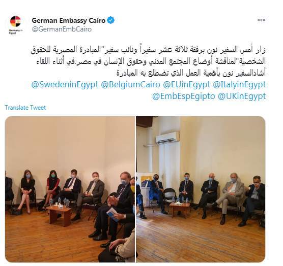 وكتبت السفارة الألمانية تغريدة على تويتر "زار أمس السفير نون برفقة ثلاثة عشر سفيراً ونائب سفير"المبادرة المصرية للحقوق الشخصية" لمناقشة أوضاع المجتمع المدني وحقوق الإنسان في مصر. في أثناء اللقاء أشادالسفير نون بأهمية العمل الذي تضطلع به المبادرة"