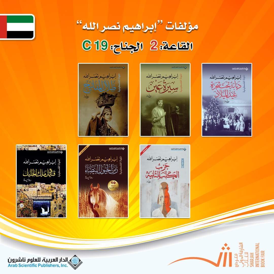 يشارك الكاتب الروائي الفلسطيني إبراهيم نصر الله ، في معرض الشارقة الدولي للكتاب، بستة روايات تنوعت مابين التاريخية ، والرومانسية، والروايات هي؛" حرب الكلب الثانية - زمن الخيول البيضاء- قناديل ملك الجليل - ظلال المفاتيح - سيرة عين-و رواية دبابة تحت شجرة عيد الميلاد".