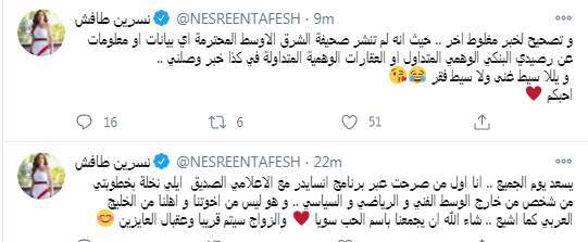 وكتبت نسرين طافش تغريدة على تويتر "يسعد يوم الجميع.. انا اول من صرحت عبر برنامج انسايدر مع الاعلامي الصديق ايلي نخلة بخطوبتي من شخص من خارج الوسط الفني و الرياضي والسياسي.. و هو ليس من اخوتنا واهلنا من الخليج العربي كما اشيع.. شاء الله ان يجمعنا باسم الحب سويا والزواج سيتم قريبا وعقبال العايزين"