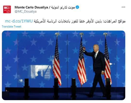 وقالت إذاعة مونت كارلو إن انتخابات 2020 في الولايات المتحدة في طريقها لتكون أكبر حدث يجتذب المراهنات على الإطلاق حسبما تقول شركات الرهان. وراهن شخص ما على فوز بايدن بمبلغ قياسي بلغ مليون جنيه استرليني يوم الاثنين الماضي.