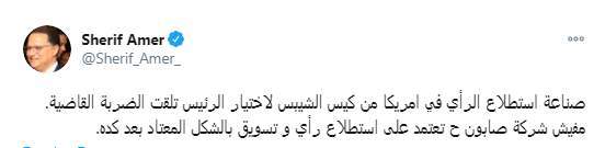 وكتب شريف عامر تغريدة على تويتر "صناعة استطلاع الرأي في امريكا من كيس الشيبس لاختيار الرئيس تلقت الضربة القاضية، مفيش شركة صابون ح تعتمد على استطلاع رأي وتسويق بالشكل المعتاد بعد كده"