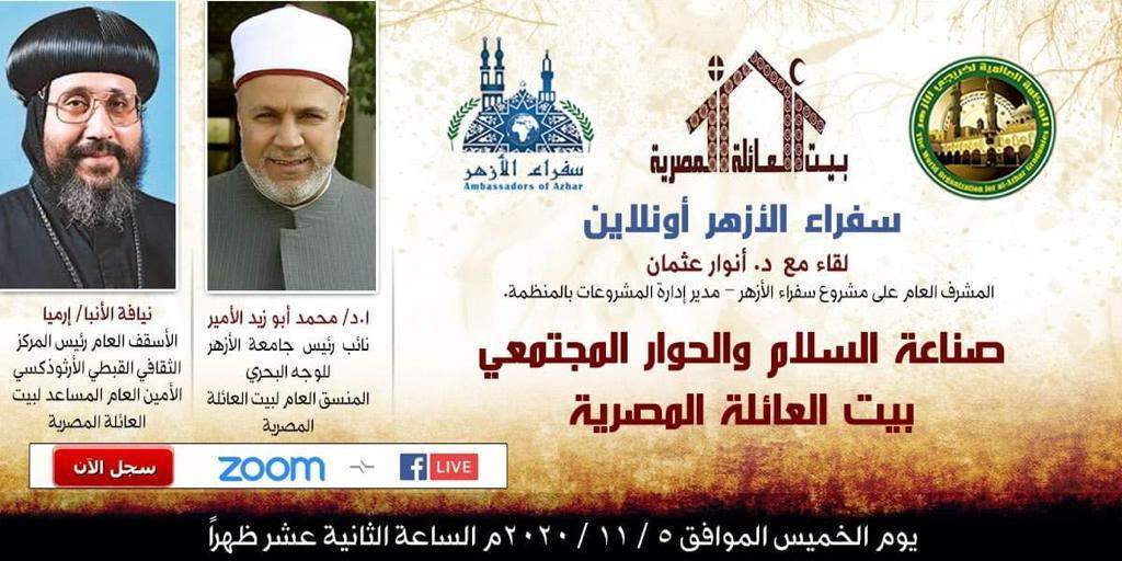 تدير اللقاء الدكتوره أنوار عثمان، المشرف العام على مشروع سفراء الأزهر، مدير إدارة المشروعات بالمنظمة، ويتم بث اللقاء غدًا عبر الموقع الرسمي للمنظمة، والصفحة الرسمية للمنظمة عبر الفيسبوك، ومن خلال صفحات الكليات المختلفة بجامعة الأزهر، والمنصات الخاصة ببيت العائلة المصرية.