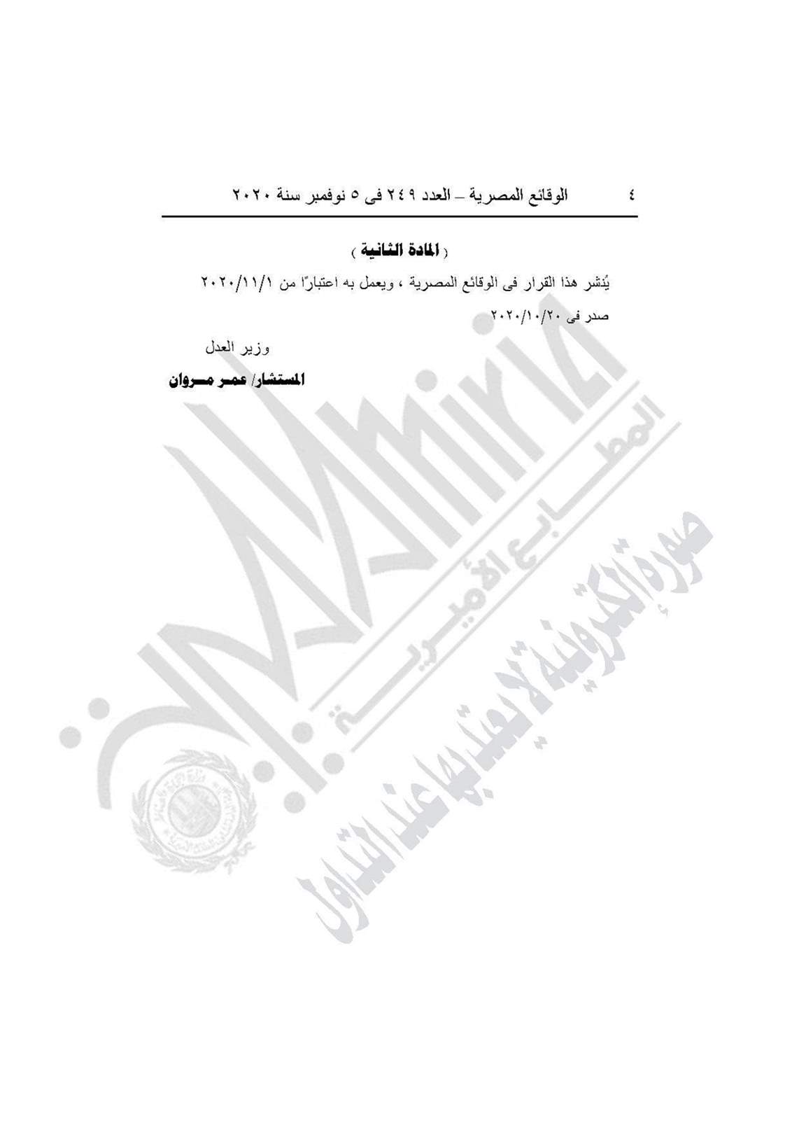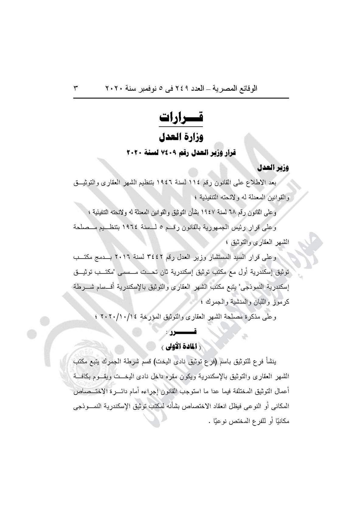 نشرت جريدة الوقائع المصرية في عددها 249، الصادر في 5 نوفمبر 2020، 3 قرارات لوزير العدل المستشار عمر مروان بإنشاء فرع للتوثيق باسم (فرع توثيق نادى اليخت) قسم شرطة الجمرك، يتبع مكتب الشهر العقارى والتوثيق بالإسكندرية، ويؤجل ميعاد سريان نظام السجل العينى على الأقسام المساحية بمحافظة قنا والقسم المساحى المنصورية - مركز إمبابة بمحافظة الجيزة.