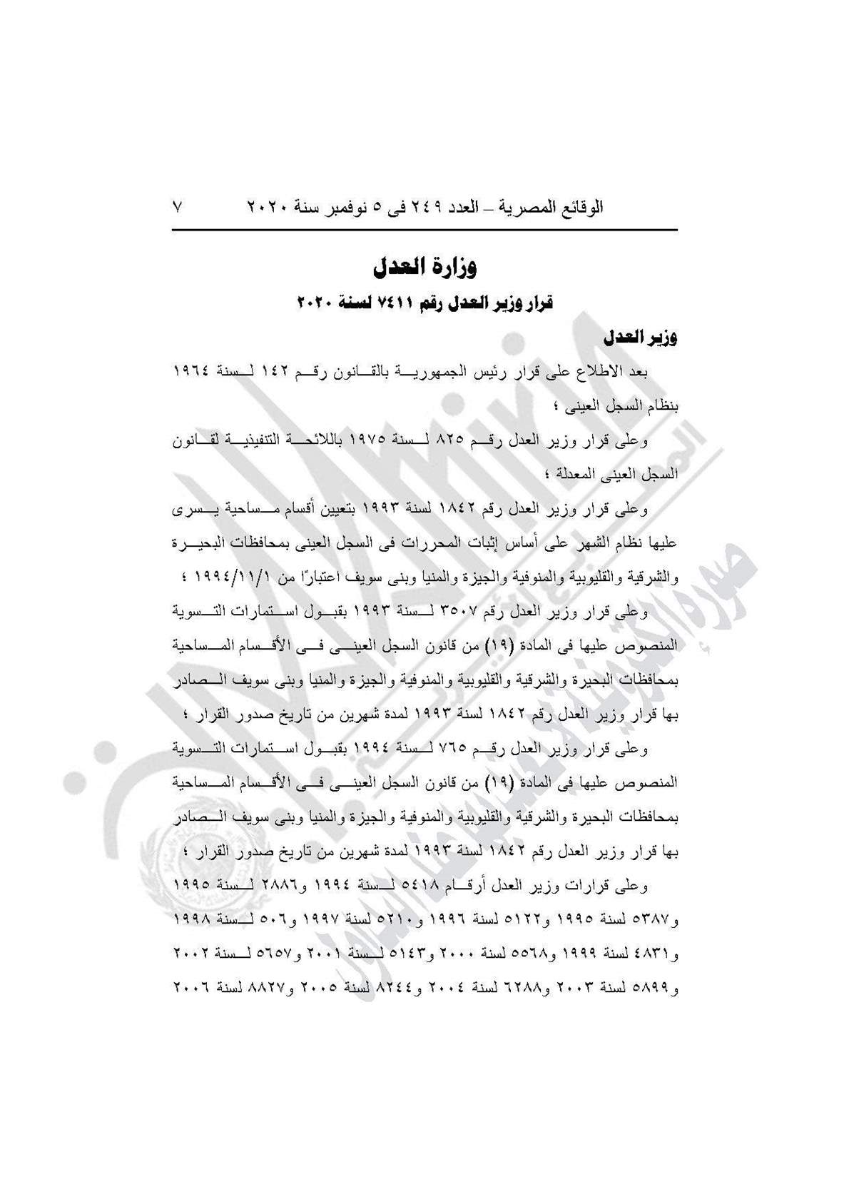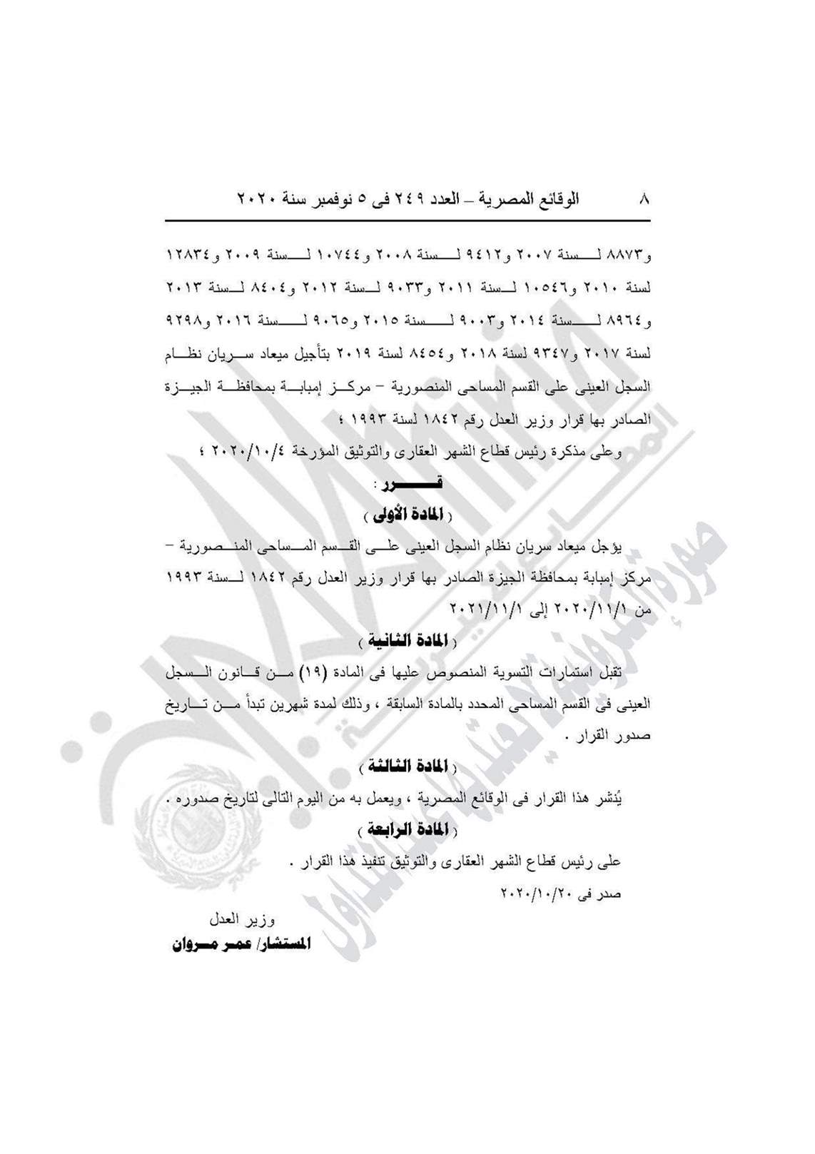 - القرار 7411 لسنة 2020، يؤجل ميعاد سريان نظام السجل العينى على القسم المساحى المنصورية - مركز إمبابة بمحافظة الجيزة الصادر بها قرار وزير العدل رقم 1842 لسنة 1993 من 1/11/2020 إلى 1/11/2021.
