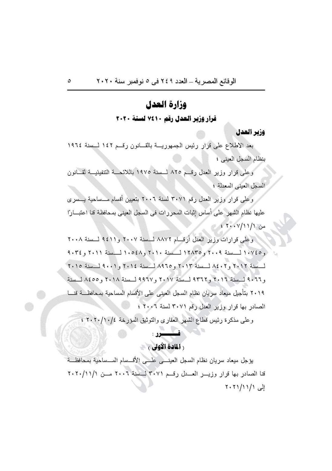 - القرار رقم 4710 لسنة 2020، يؤجل ميعاد سريان نظام السجل العينى على الأقسام المساحية بمحافظة قنا الصادر بها قرار وزير العدل رقم 3071 لسنة 2006 من 1/11/2020 إلى 1/11/2021.