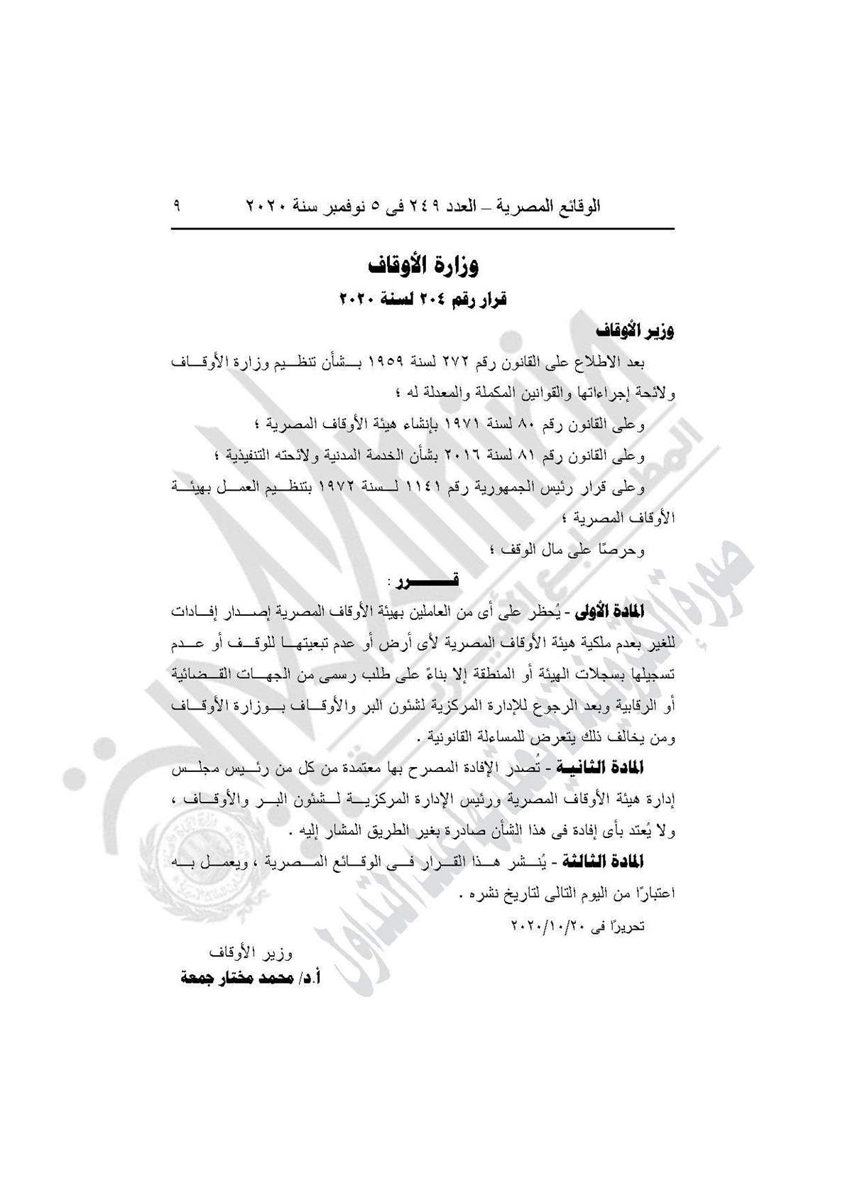 نشرت جريدة الوقائع المصرية في عددها 249، الصادر في 5 نوفمبر 2020، قرار وزارة الأوقاف رقم 204 لسنة 2020، بشأن حظر إصدار إفادات للغير بعدم ملكية هيئة الأوقاف المصرية، لأى أرض أو عدم تبعيتها للوقف أو عدم تسجيلها بسجلات الهيئة أو المنطقة إلا بناءً على طلب رسمى من الجهات القضائية أو الرقابية وبعد الرجوع للإدارة المركزية لشئون البر والأوقاف بوزارة الأوقاف.