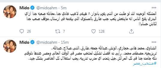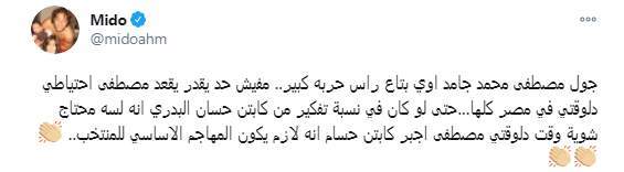 وكتب أحمد حسام "ميدو" تغريدة على تويتر: "جول مصطفى محمد جامد اوي بتاع راس حربه كبير.. مفيش حد يقدر يقعد مصطفى احتياطي دلوقتي في مصر كلها...حتى لو كان في نسبة تفكير من كابتن حسام البدري أنه لسه محتاج شوية وقت دلوقتي مصطفى اجبر كابتن حسام انه لازم يكون المهاجم الأساسي للمنتخب..".