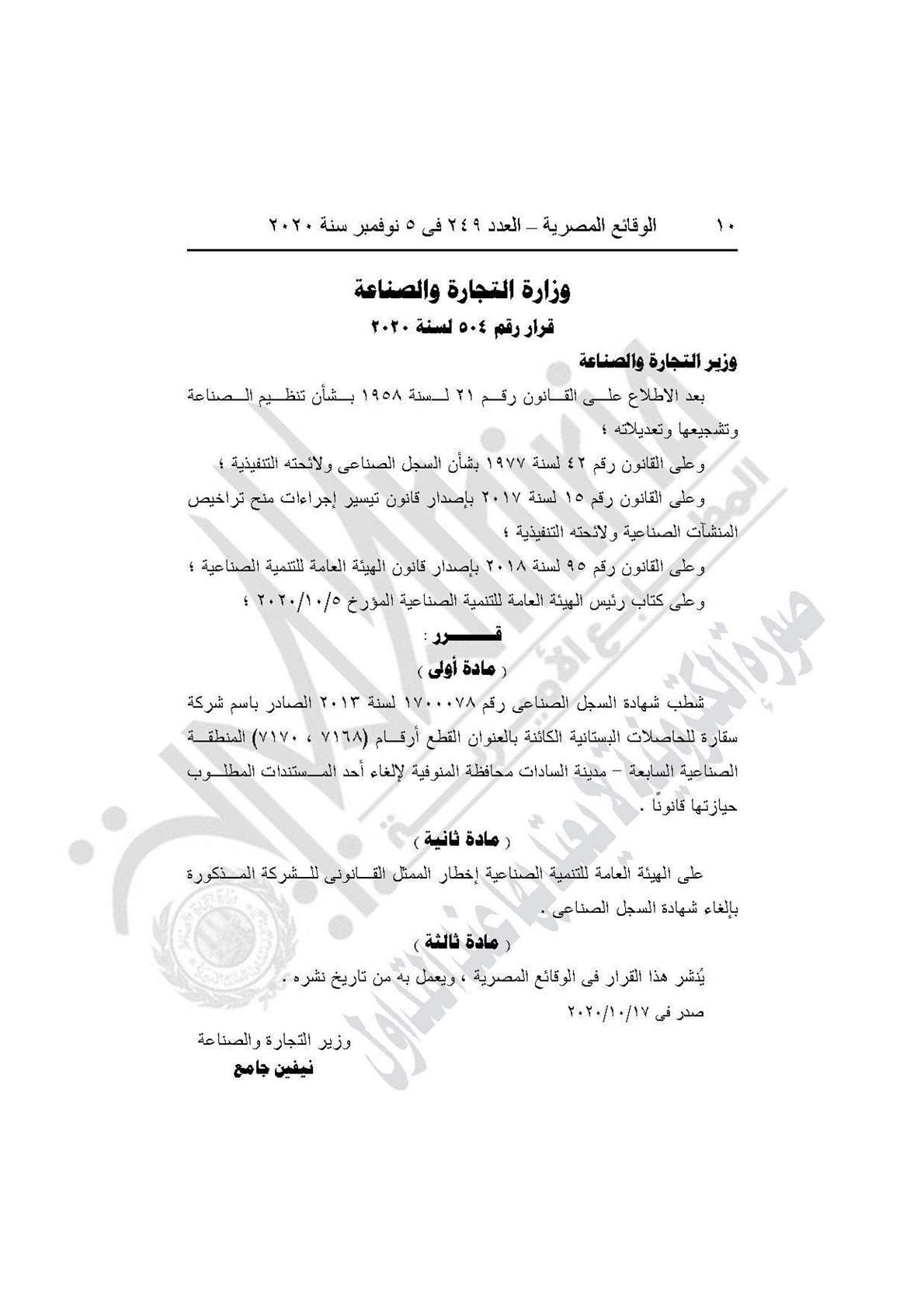 نشرت جريدة الوقائع المصرية في عددها 249، الصادر في 5 نوفمبر 2020، قرار وزارة التجارة والصناعة 504 لسنة 2020، بشأن شطب شهادة السجل الصناعى شركة سقارة للحاصلات البستانية المنطقة الصناعية السابعة - مدينة السادات محافظة المنوفية.