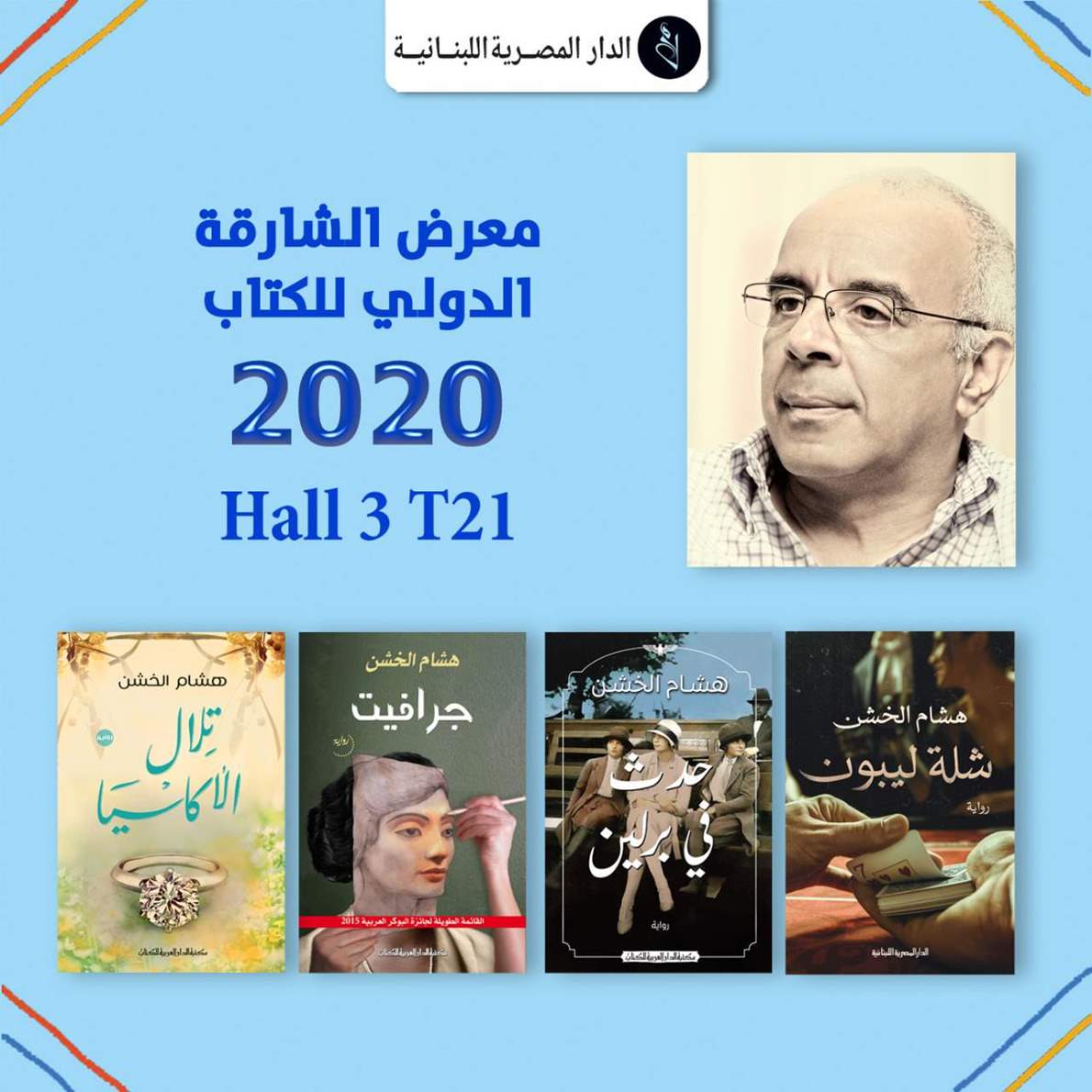 يشارك الكاتب الروائي هشام الخشن، في معرض الشارقة الدولي للكتاب، بأربعة روايات تنوعت ما بين الاجتماعية ، والرومانسية، والروايات هي "حدث في برلين - جرافيت - تلال الأكسيا - و رواية شلة ليبون الصادرة في أغسطس الماضي عن الدار المصرية اللبنانية".