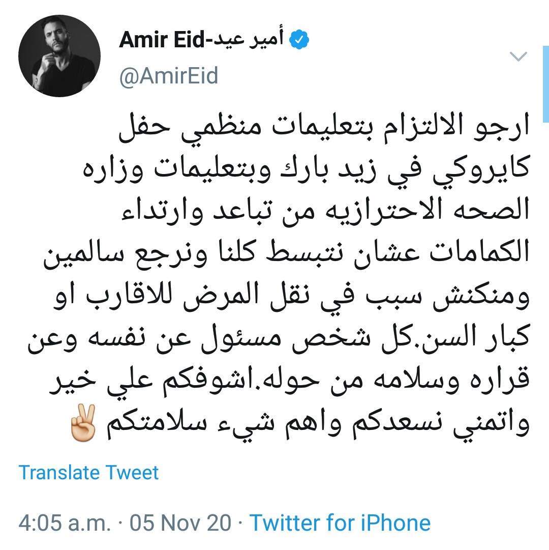 وكتب أمير عيد قائلا: "أرجو الالتزام بتعليمات منظمي حفل كايروكى، وبتعليمات وزارة الصحة الاحترازية من تباعد وارتداء الكمامات عشان نتبسط كلنا ونرجع سالمين ومنكنش سبب في نقل المرض للأقارب أو كبار السن.. كل شخص مسئول عن نفسه وعن قراره وسلامه من حوله.. أشوفكم على خير وأتمنى نسعدكم وأهم شيء سلامتكم".