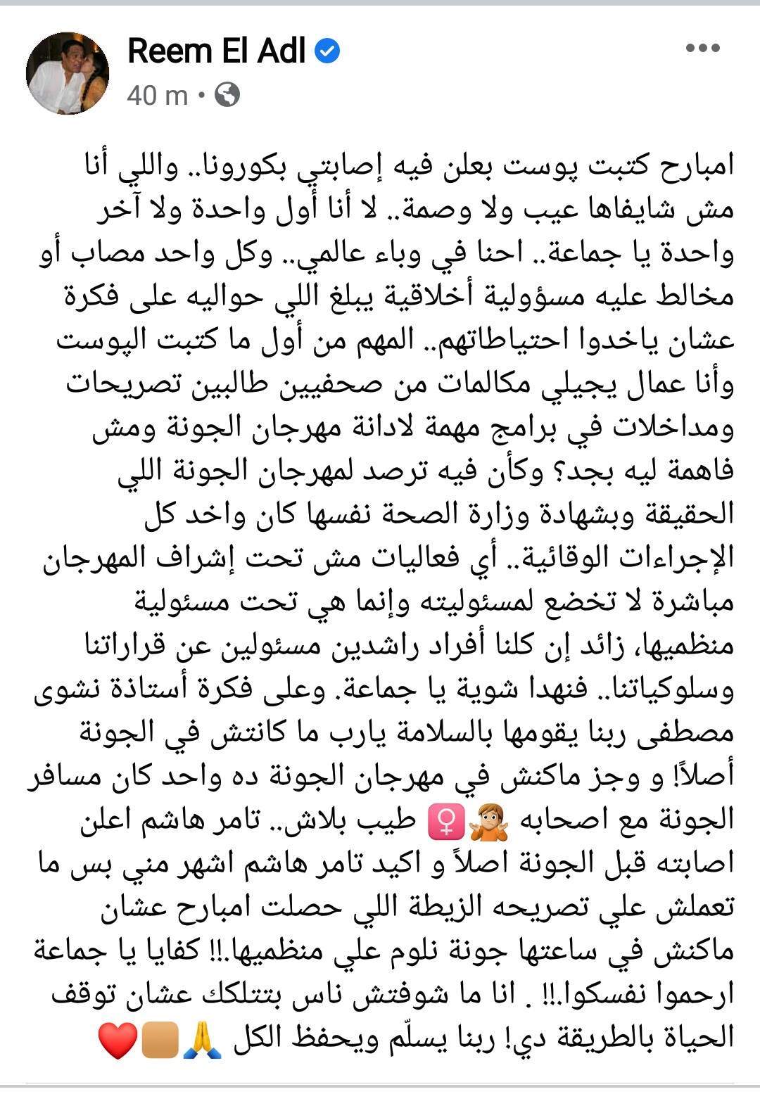 وكتبت ريم العدل على فيس بوك: "امبارح كتبت بوست بعلن فيه إصابتي بكورونا.. واللي أنا مش شايفاها عيب ولا وصمة.. ولا أنا أول واحدة ولا آخر واحدة يا جماعة.. إحنا في وباء عالمي.. وكل واحد مصاب أو مخالط عليه مسئولية أخلاقية يبلغ اللي حواليه على فكرة عشان ياخدوا احتياطاتهم".