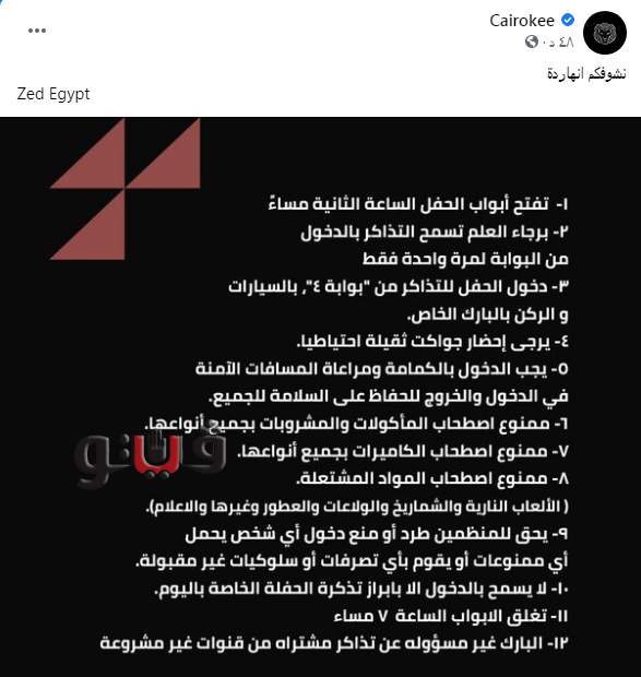 وضعت فرقة “كايروكي”، تعليمات اللازمة لحضور حفلتهم التي يحيونها اليوم الخميس، في “زيد بارك”.
