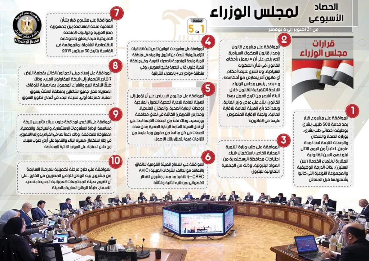 نشر المركز الإعلامي لمجلس الوزراء، تقريراً شمل إنفوجرافات سلط من خلالها الضوء على الحصاد الأسبوعي لمجلس الوزراء، وذلك خلال الفترة من 31 أكتوبر إلى 6 نوفمبر، والذي تضمن الموافقة على عدد من القرارات، فضلاً عن الاجتماعات واللقاءات التي عقدها الدكتور مصطفى مدبولي، رئيس مجلس الوزراء، بالإضافة إلى ما قام به من أنشطة.