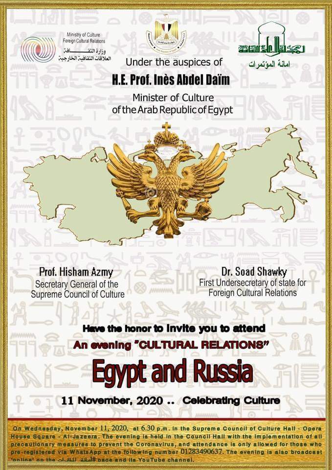 تتضمن الأمسية كلمة للدكتورة إيناس عبد الدايم وزيرة الثقافة المصرية، ويشارك كل من: السفير جيورجى بوريسينكو، سفير روسيا بالقاهرة، والسفير عزت سعد، رئيس المجلس المصرى للشئون الخارجية.