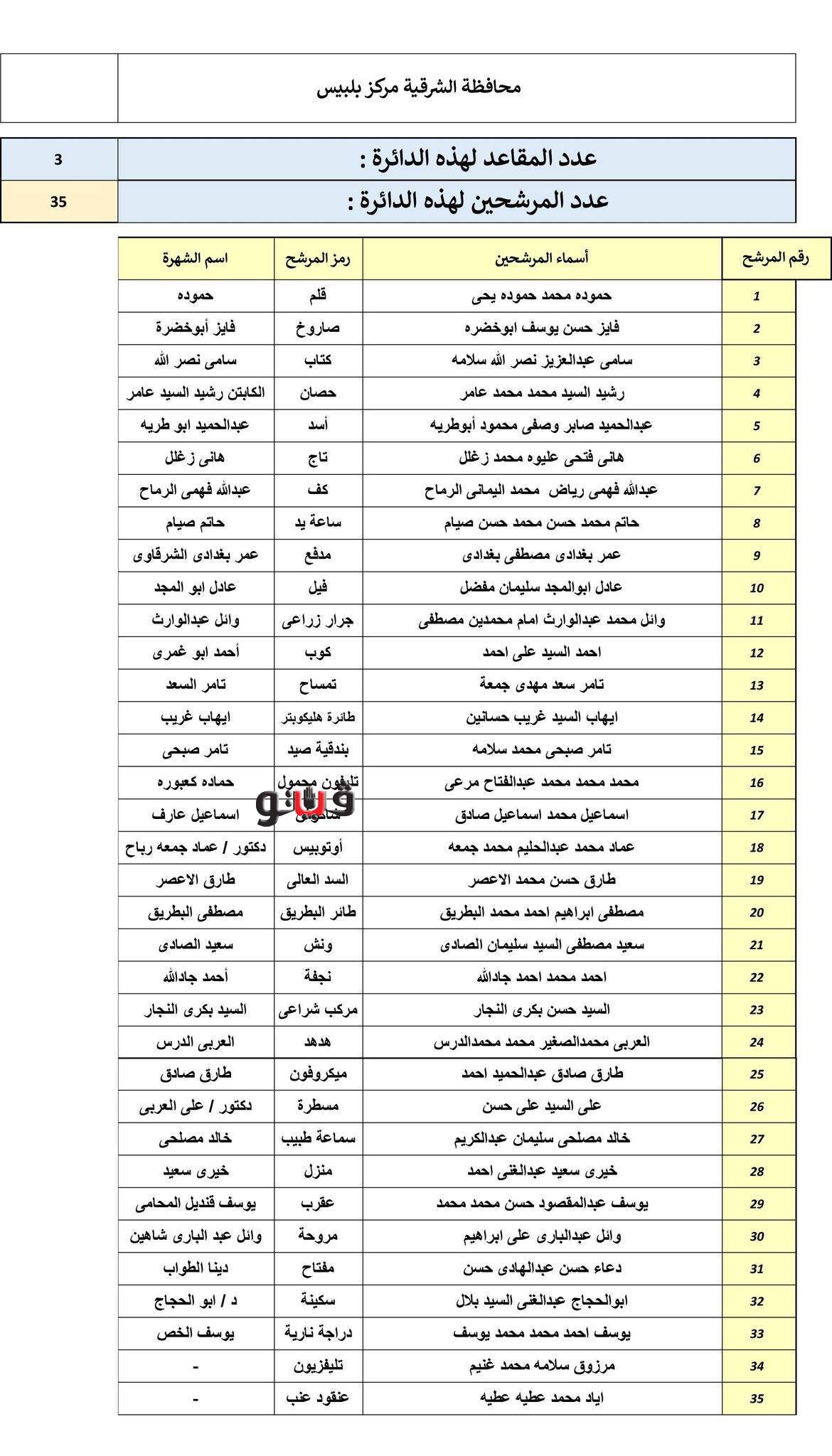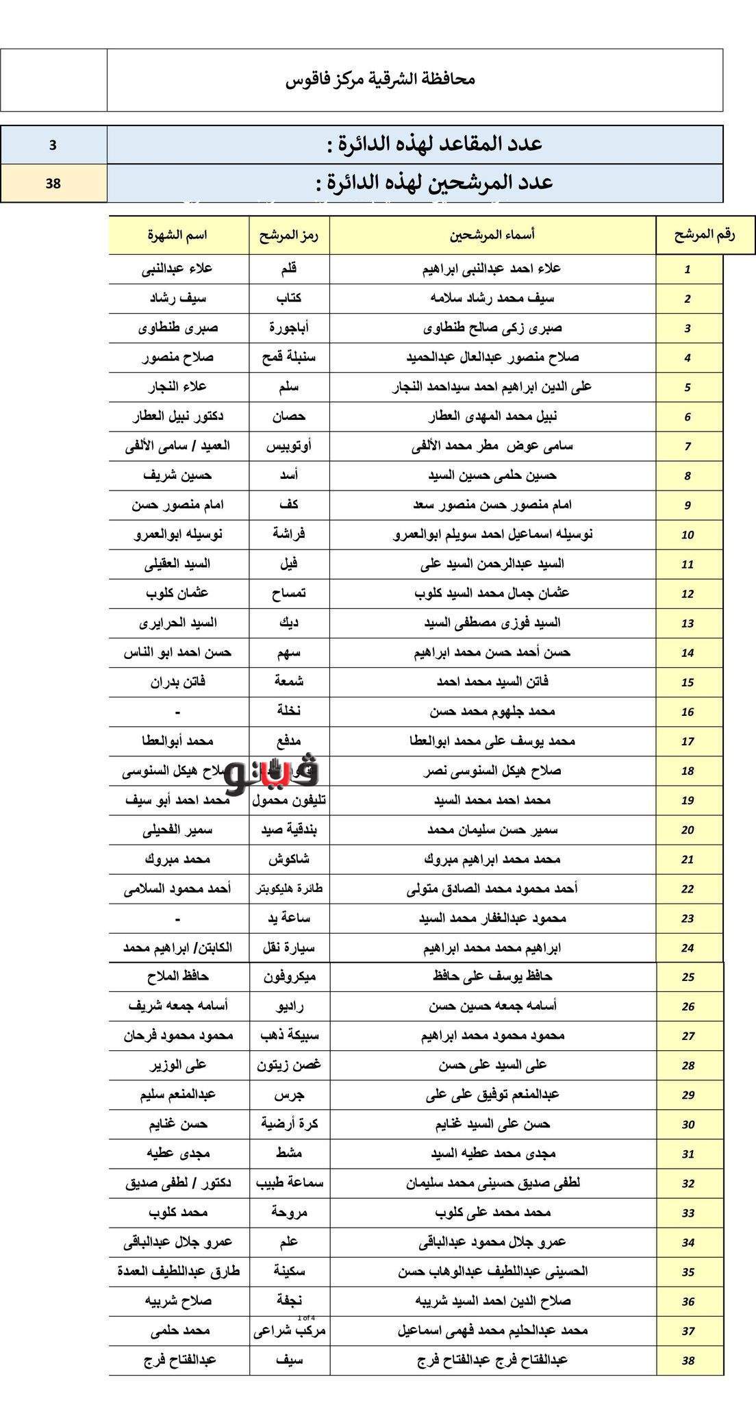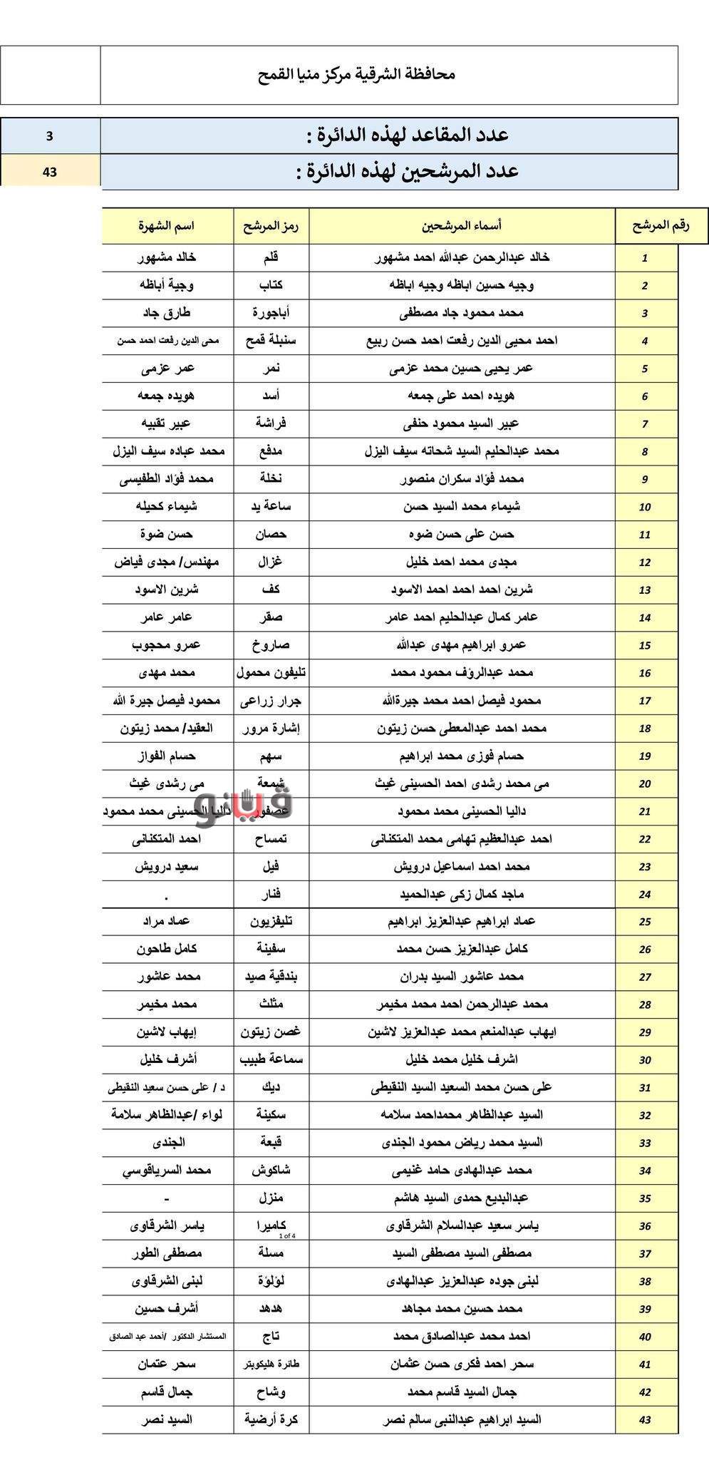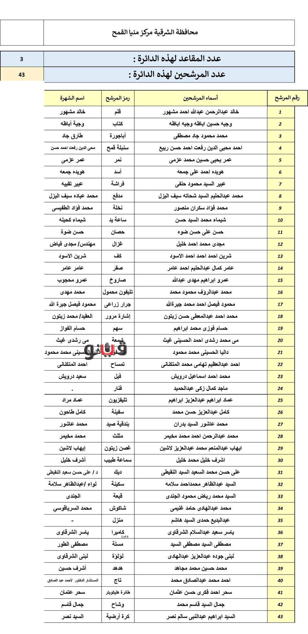 وفيما يلي أسماء المرشحين في محافظة الشرقية: