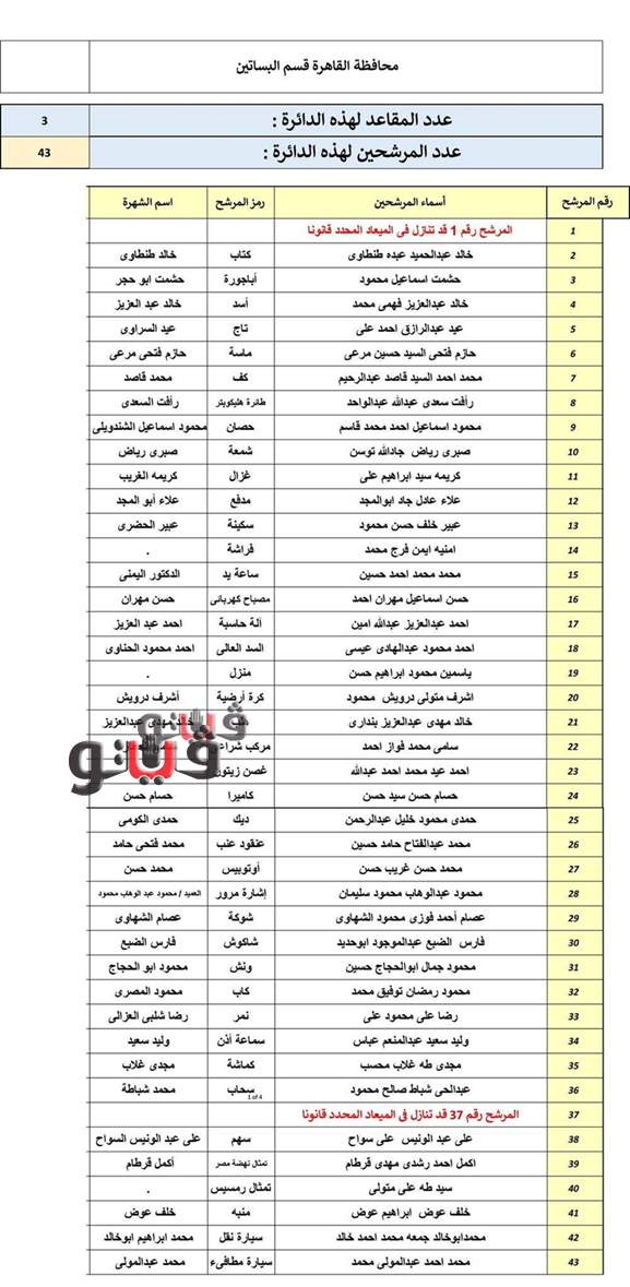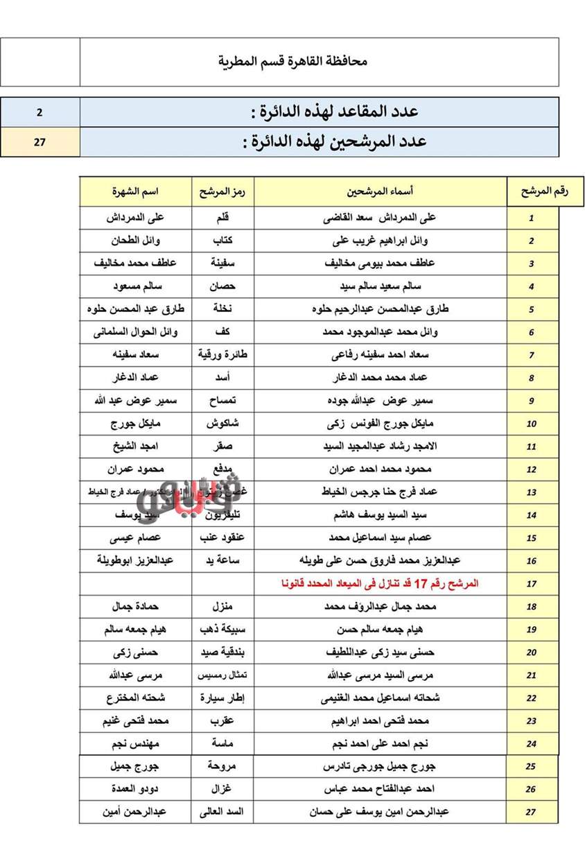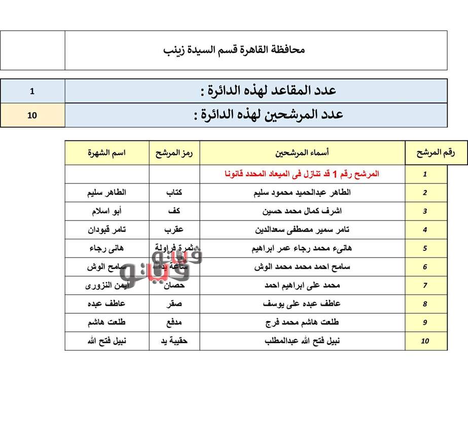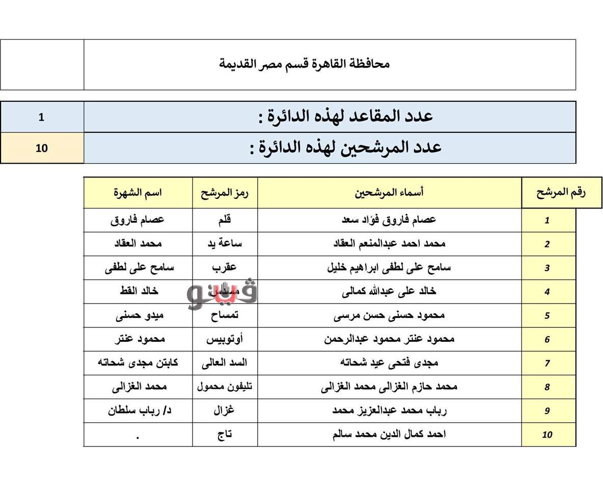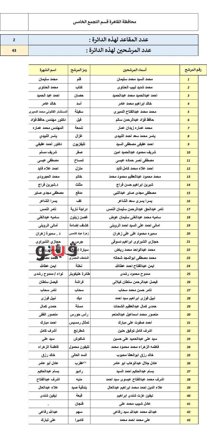 وفيما يلي أسماء المرشحين في محافظة القاهرة:
