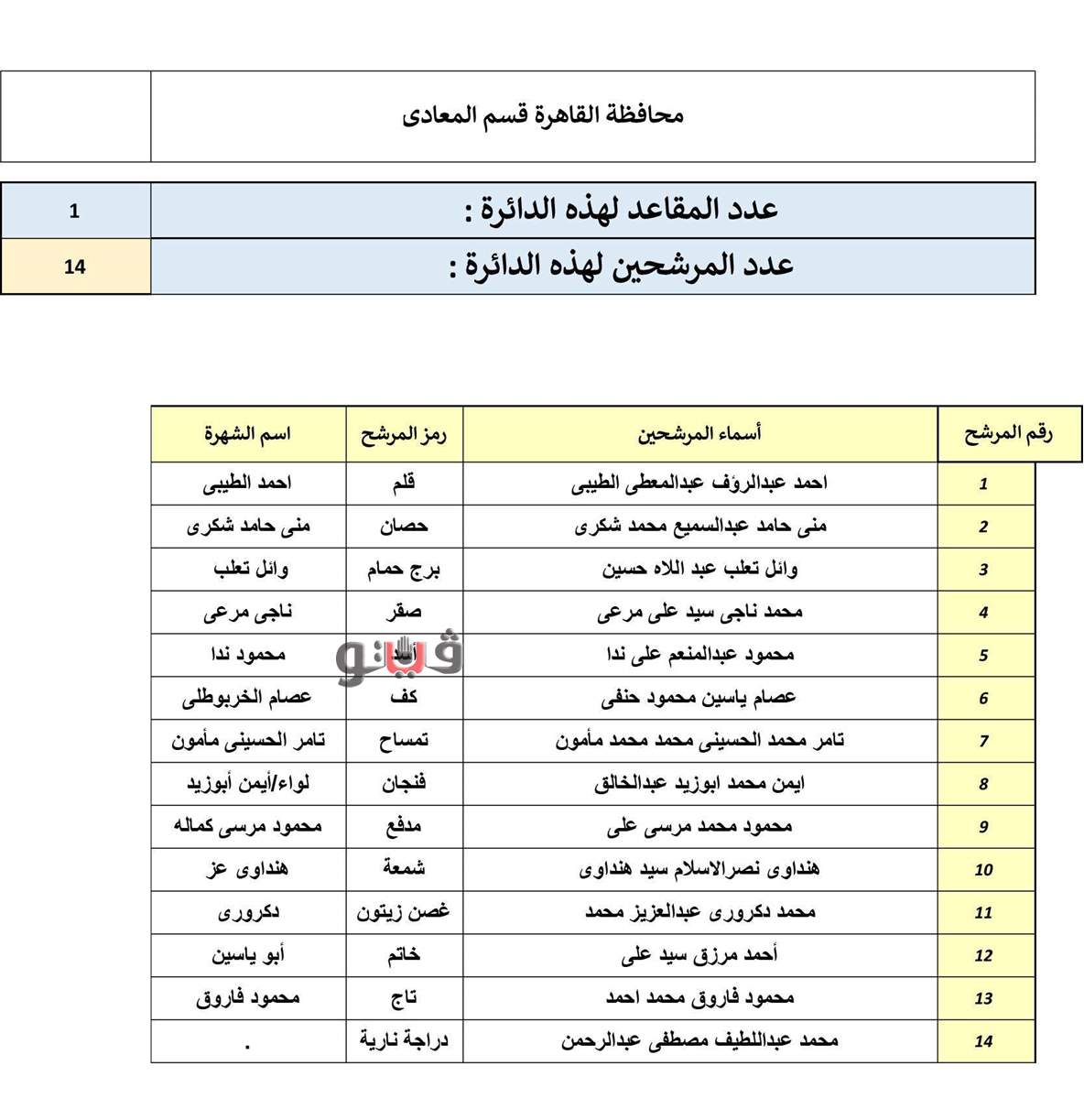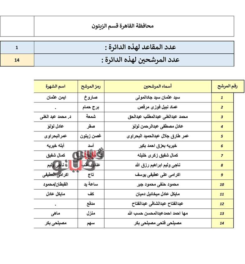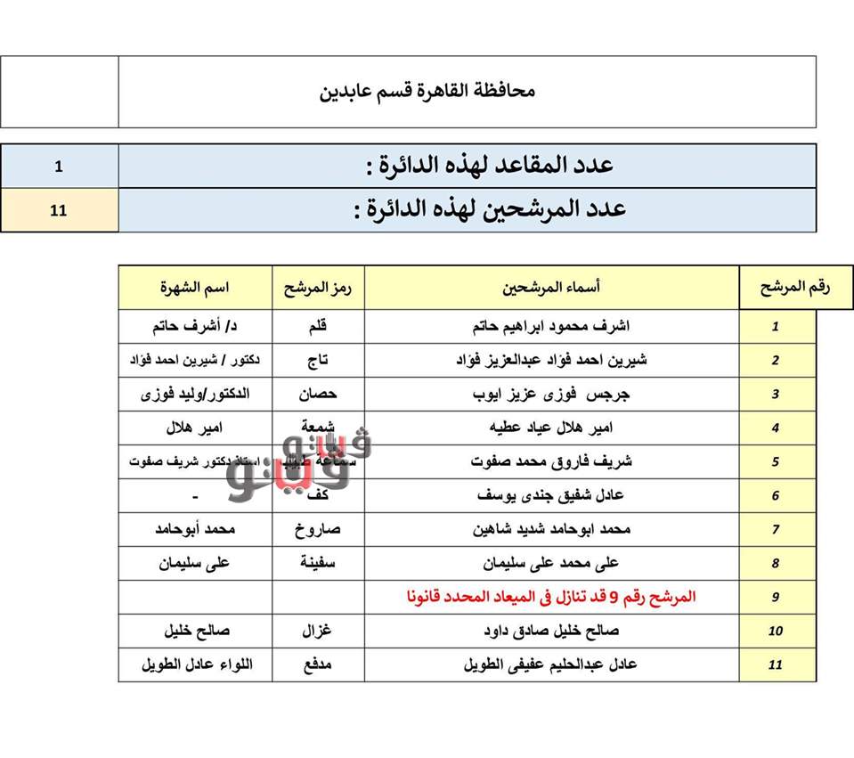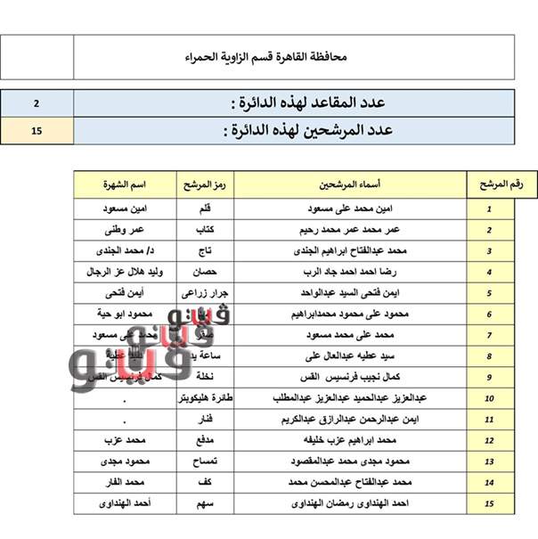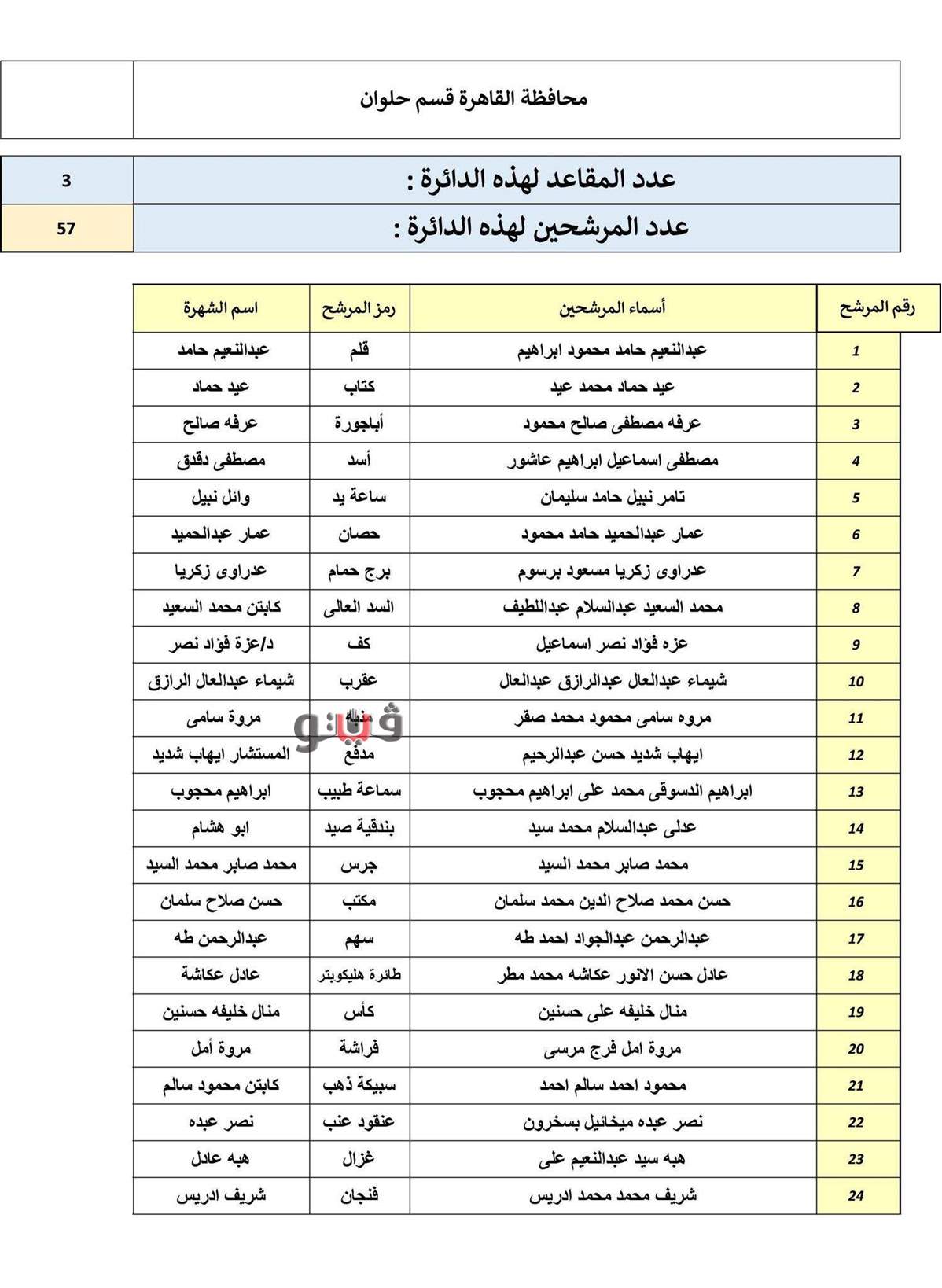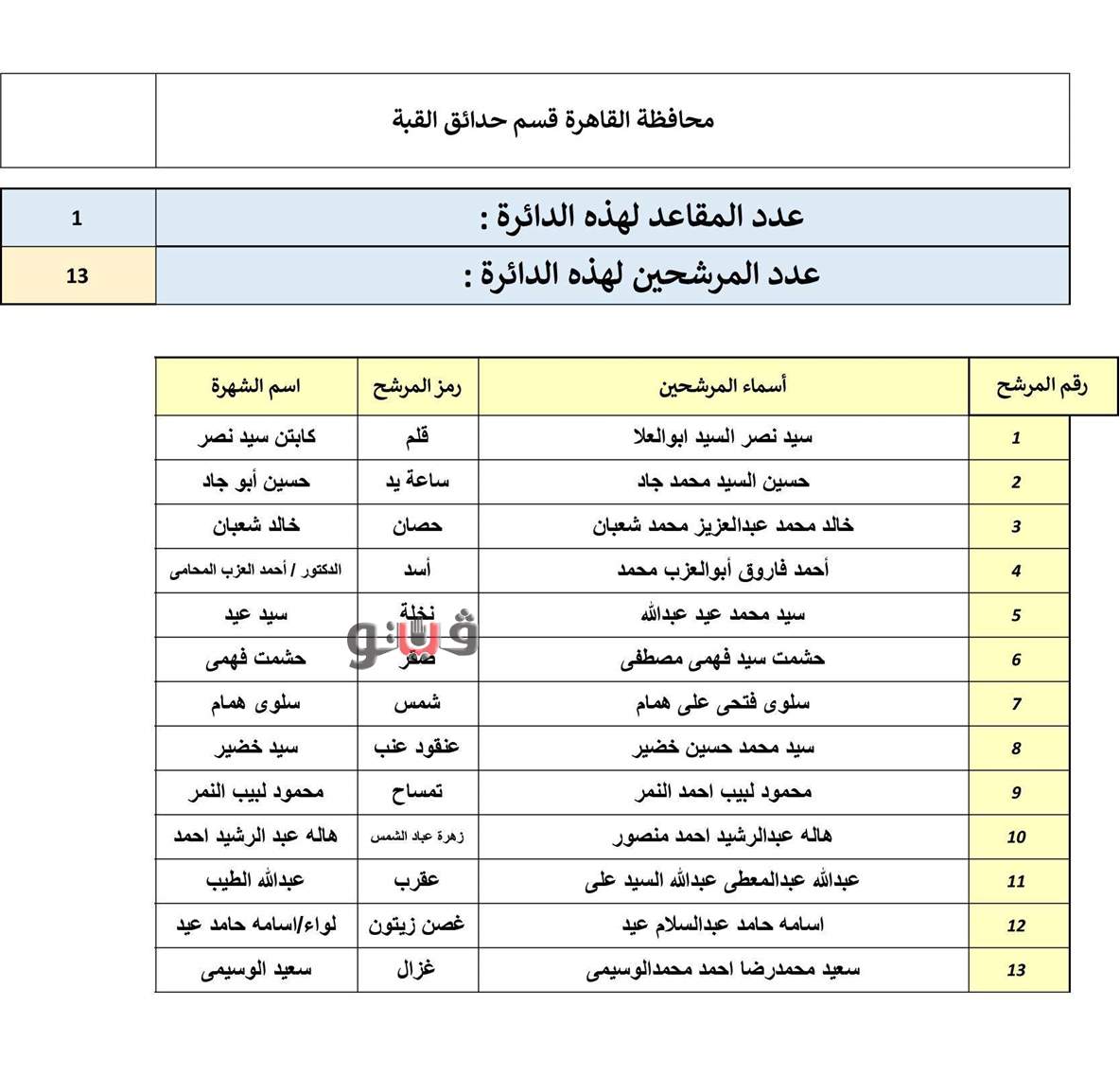 وفيما يلي أسماء المرشحين في محافظة القاهرة: