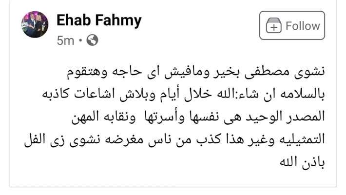 وكتب إيهاب فهمي عبر حسابه الرسمي على موقع التواصل الاجتماعي "فيس بوك": "نشوى مصطفى بخير، ومفيش أى حاجة، وهتقوم بالسلامة إن شاء الله خلال أيام، وبلاش إشاعات كاذبة، المصدر الوحيد هى نفسها وأسرتها ونقابة المهن التمثيلية وغير هذا كذب من ناس مغرضة، نشوى زى الفل بإذن الله".