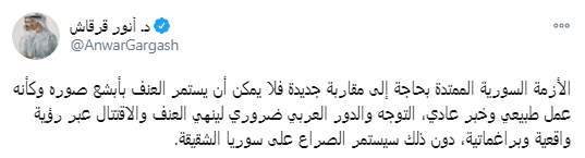 وكتب أنور قرقاش تغريدة على تويتر" "الأزمة السورية الممتدة بحاجة إلى مقاربة جديدة فلا يمكن أن يستمر العنف بأبشع صوره وكأنه عمل طبيعي وخبر عادي، التوجه والدور العربي ضروري لينهي العنف والاقتتال عبر رؤية واقعية وبراغماتية، دون ذلك سيستمر الصراع على سوريا الشقيقة"