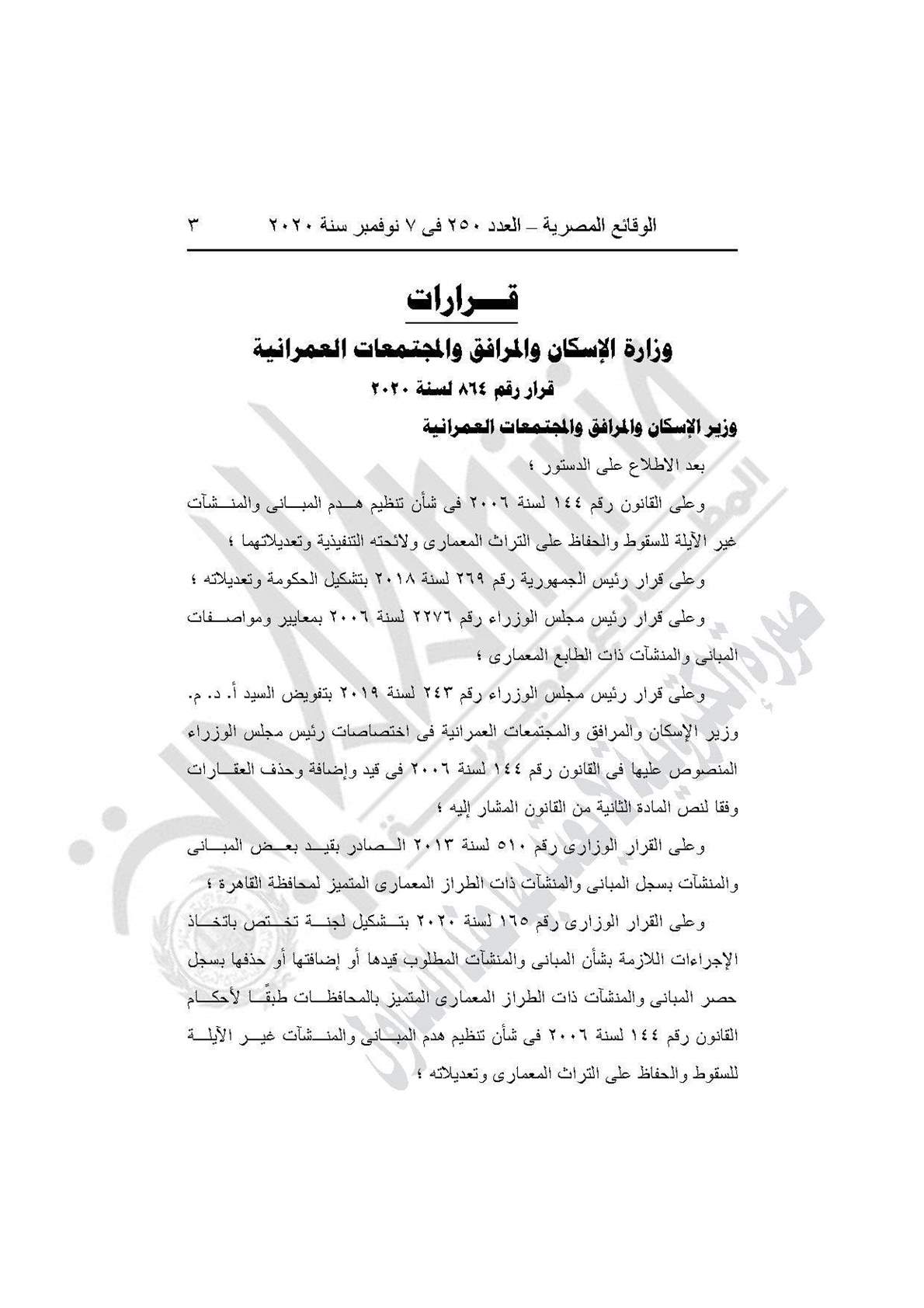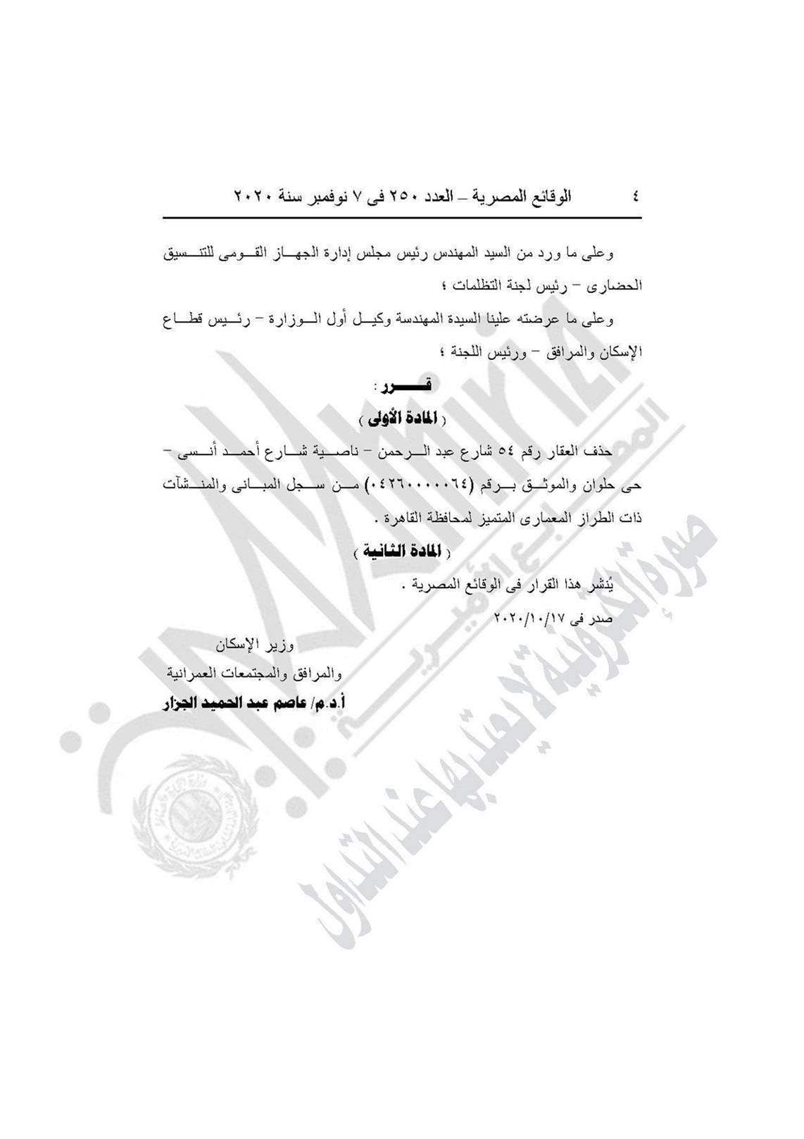 وينص القرار على حذف العقار رقم 54 شارع عبد الرحمن- ناصية شارع أحمد أنسي بحي حلوان من سجل المباني والمنشآت ذات الطراز المعماري المتميز لمحافظة القاهرة.