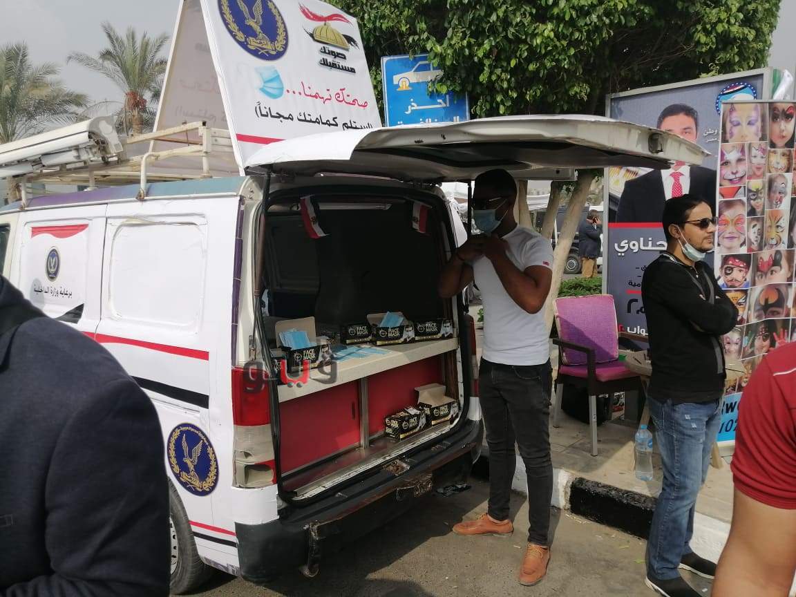 دفع قسم شرطة التجمع الأول بالرحاب بعربة محملة بأعلام مصر والكمامات الطبية لتوزيعها على الناخبين مجانا قبل دخولهم إلى لجان الاقتراع داخل المدرسة البريطانية.