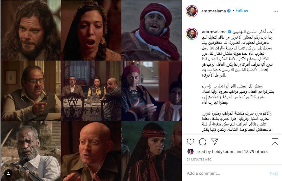 وكتب عمرو سلامة عبر إنستجرام: "أحب أشكر الممثلين الموهوبين جدا دول وكل الممثلين الآخرين من طاقم التمثيل اللي ماعرفتش أحطهم في الصورة، كنا محظوظين بيكم ومحظوظين إن كان عندنا الرخصة والوقت إننا نعمل تجارب أداء لمدة طويلة علشان نختار لكل دور الأفضل موهبة والأكثر ملائمة للشكل المتخيل فقط بدون أي عوامل أخرى (ربما يكون العامل الوحيد هو إعطاء الأفضلية للنقابيين الدارسين عندما تتساوى العوامل الأخرى).