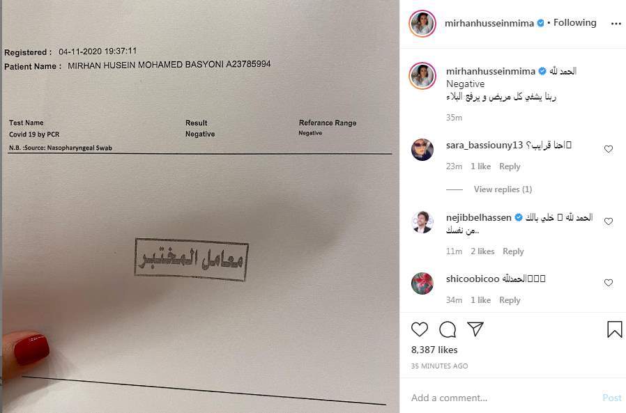 وكتبت ميرهان حسين تغريدة على إنستجرام "الحمد لله Negative.. ربنا يشفي كل مريض ويرفع البلاء".