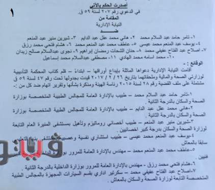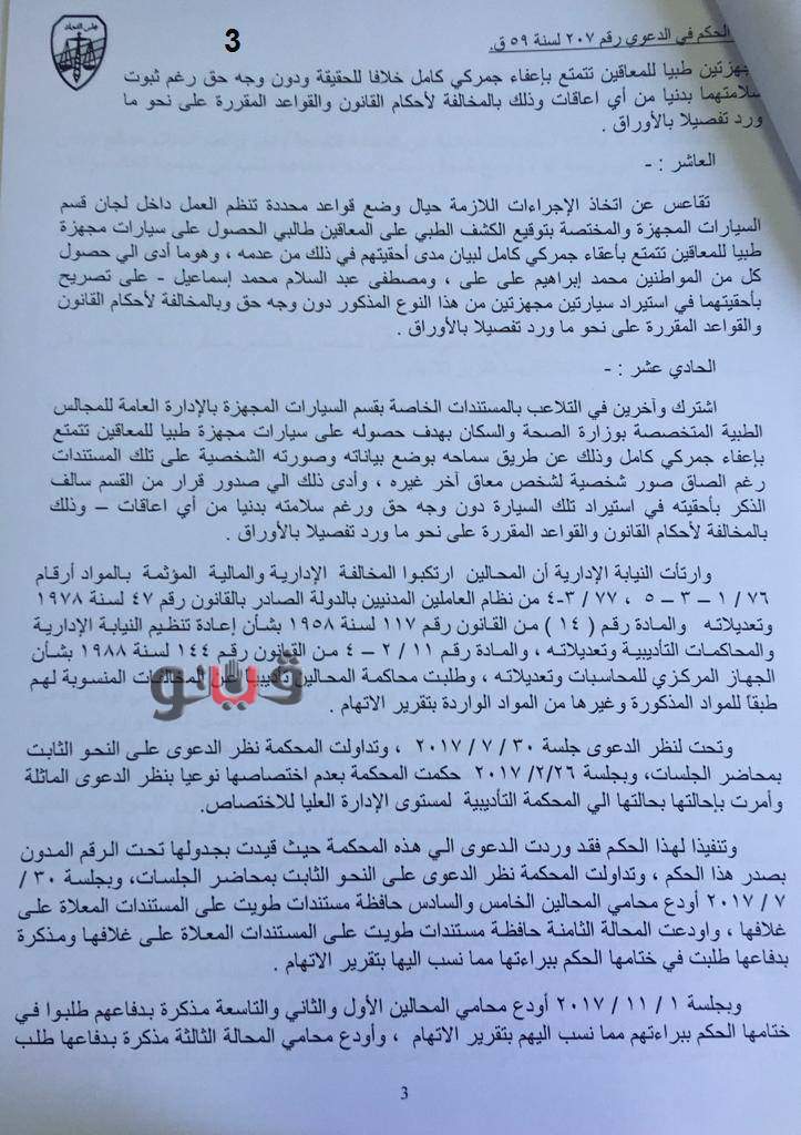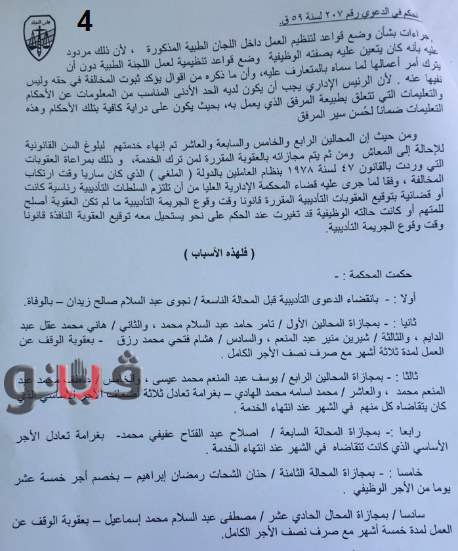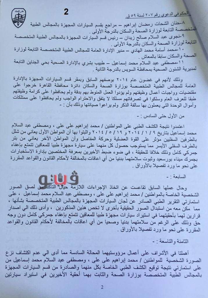 وتضمن الحكم تغريم«إصلاح عبد الفتاح عفيفي» سكرتير إداري بقسم السيارات المجهزة بالمجالس الطبية المتخصصة التابعة لوزارة الصحة بما يعادل أجرها الأساسي الذي كانت تتقاضاه في الشهر عند انتهاء خدمته، وخصم أجر 15 يوما من راتب الدكتورة «حنان الشحات رمضان» مراجع بقسم السيارات المجهزة، وتغريم الدكتور «محمد أسامة الهادي» مسئول بالإدارة العامة للمجالس الطبية المتخصصة بما يعادل ثلاثة أضعاف الأساسي الذي كان يتقاضاه في الشهر عند انتهاء خدمته، وإيقاف«مصطفى عبد السلام محمد» طبيب بإدارة الجناين الصحية عن لمدة خمسة أشهر.