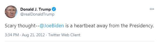 وكتب دونالد ترامب في تغريدته القديمة "تفكير مخيف.. جو بايدن نبض القلب يخرج من سباق الرئاسة"