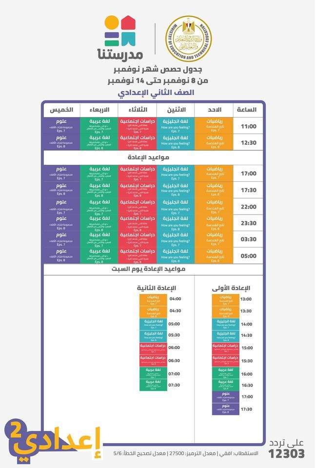 وأشارت وزارة التربية والتعليم والتعليم الفني، عبر صفحتها الرسمية على موقع التواصل الاجتماعي "فيس بوك"، أن جدول الحصص الاسبوع للطلاب خلال الفترة من يوم الأحد ٨ نوفمبر حتى السبت ١٤ نوفمبر ٢٠٢٠.