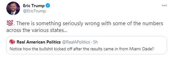 وكتب أريك ترامب تغريدة على تويتر "هناك خطأ خطير في بعض الأرقام عبر الولايات المختلفة. أنا أشك بشدة في آلات التصويت هذه"