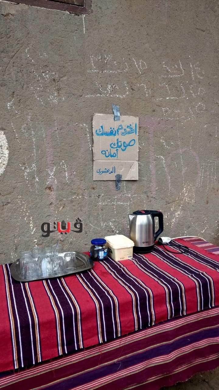 قام أحد المواطنين بقرية زاوية جروان التابعة لمركز الباجور بمحافظة المنوفية، بوضع عدد من الأكواب الورقية الصالحة للشرب بها وبجانبها سكر ومعالق وشاي، واضع لافتة مكتوب عليها بخط اليد "إخدم نفسك .. صوتك أمانة " .