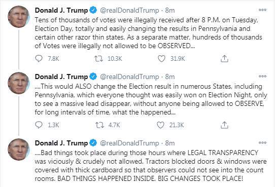 وكتب دونالد ترامب تغريدة على تويتر: "تم استلام عشرات الآلاف من الأصوات بشكل غير قانوني بعد الساعة 8 مساءً. في يوم الثلاثاء ، يوم الانتخابات ، ما يغير النتائج تمامًا وبسهولة في ولاية بنسلفانيا وبعض الولايات الأخرى الحادة والرقيقة. وكمسألة منفصلة، لم يُسمح بمراقبة مئات الآلاف من الأصوات بشكل غير قانوني"