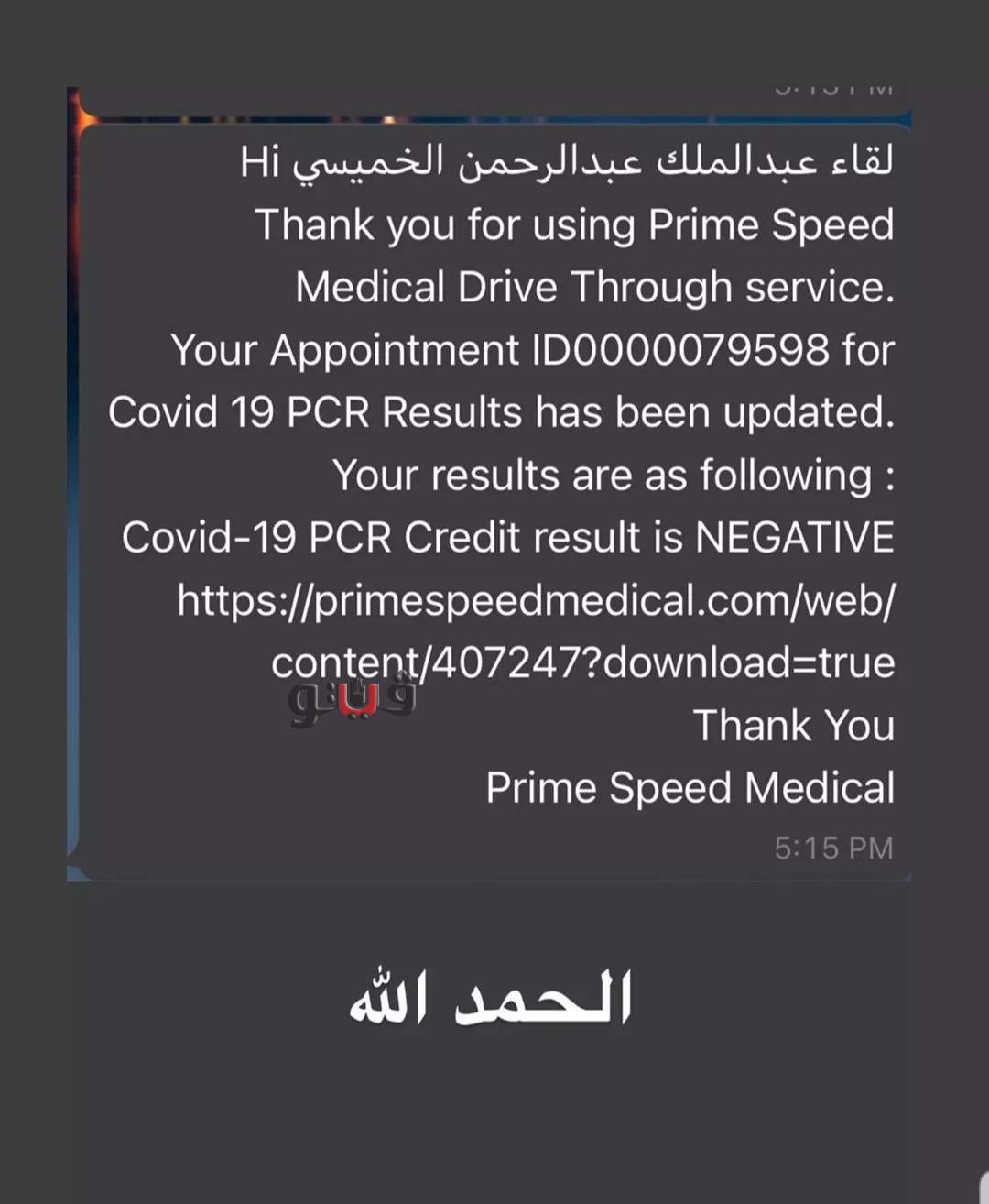 نشرت الفنانة لقاء الخميسى نتيجة تحليل pcr التى خضعت لها للاطمئنان على حالتها الصحية والتأكد من عدم اصابتها بفيروس كورونا .