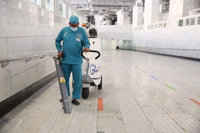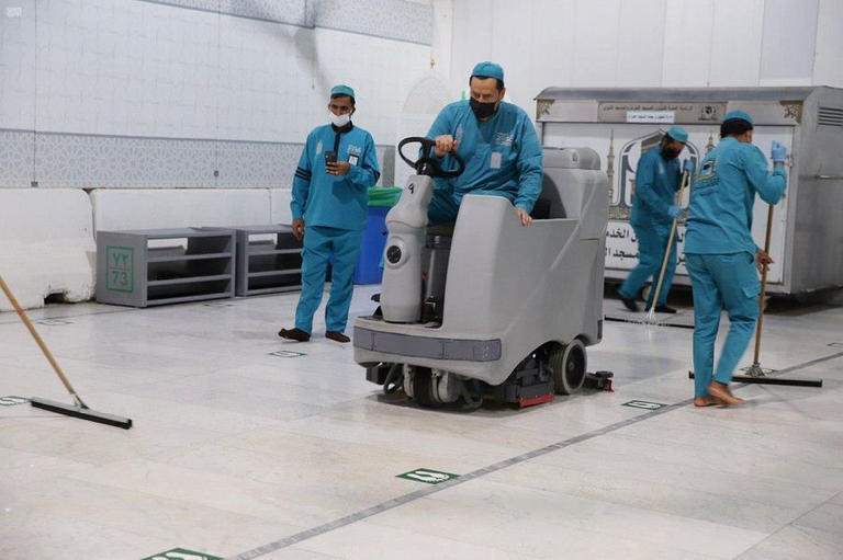 تتولى الرئاسة العامة لشئون المسجد الحرام والمسجد النبوي في السعودية تطهير وتعقيم ساحات وصحن المطاف على مدار الساعة.