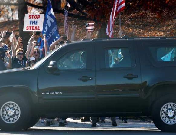 وأظهرت مجموعة من الصور، ترامب وهو عابراً في موكبه أمام حشود تحتفل في الشارع بهزيمته.