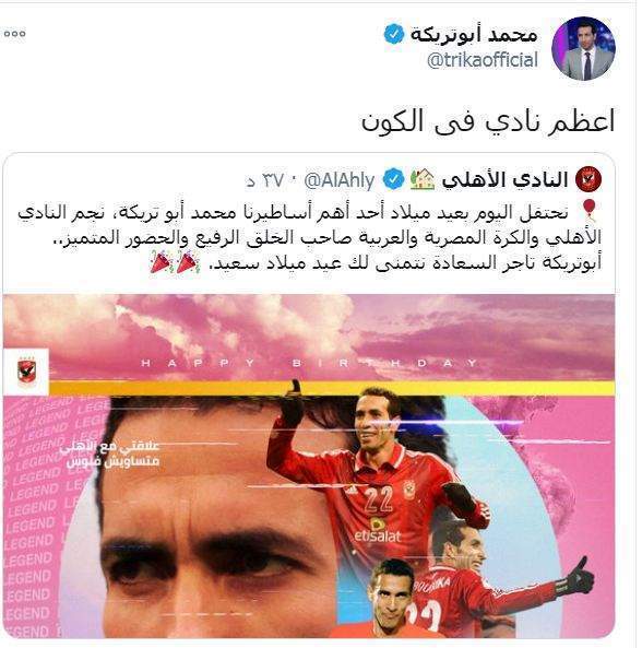 وأعاد "أبو تريكة" نشر التغريدة الخاصة بعيد ميلاده من على صفحة الأهلي، وعلق عليها قائلًا: "أعظم نادي في الكون".