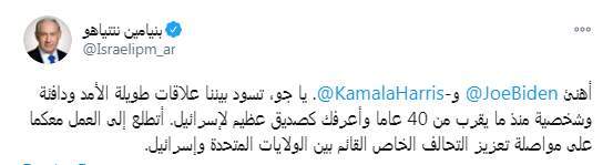 وكتب نتنياهو تغريدة على تويتر "أهنئ @JoeBiden و@KamalaHarris.. يا جو، تسود بيننا علاقات طويلة الأمد ودافئة وشخصية منذ ما يقرب من 40 عاما وأعرفك كصديق عظيم لإسرائيل. أتطلع إلى العمل معكما على مواصلة تعزيز التحالف الخاص القائم بين الولايات المتحدة وإسرائيل"