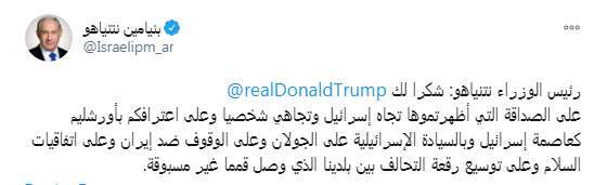 وقال "رئيس الوزراء نتنياهو: شكرا لك @realDonaldTrump على الصداقة التي أظهرتموها تجاه إسرائيل وتجاهي شخصيا وعلى اعترافكم بأورشليم كعاصمة إسرائيل وبالسيادة الإسرائيلية على الجولان وعلى الوقوف ضد إيران وعلى اتفاقيات السلام وعلى توسيع رقعة التحالف بين بلدينا الذي وصل قمما غير مسبوقة"
