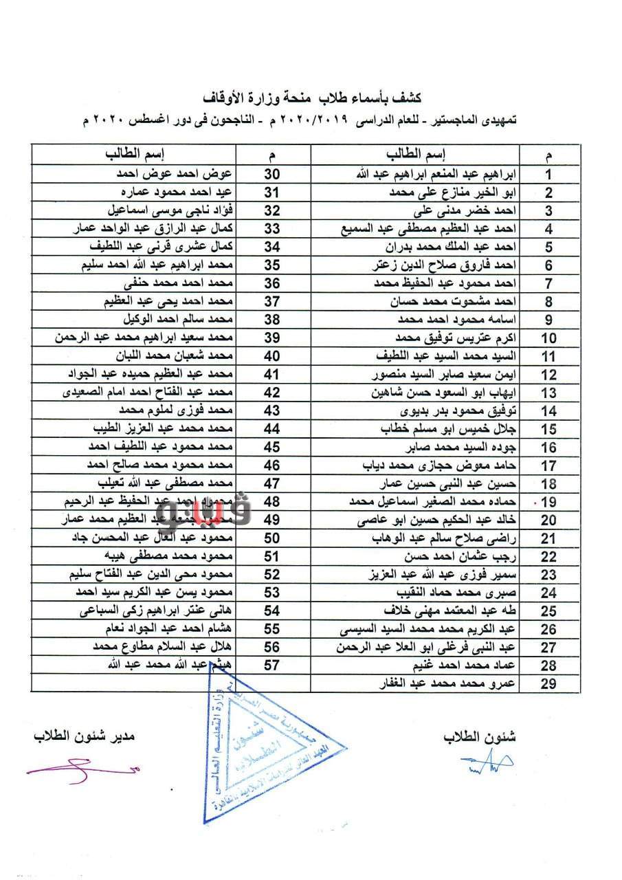 أعلنت وزارة الأوقاف أسماء الناجحين في تمهيدي الماجستير ممن أنهوا مرحلة الدراسات العليا (سنتين والسنة التمهيدية للماجستير) في الدور الأول أغسطس2020 م بتفوق من المسجلين على منحة الماجستير بالتعاون بين وزارة الأوقاف ووزارة التعليم العالي ممثلة في المعهد العالي للدراسات الإسلامية.