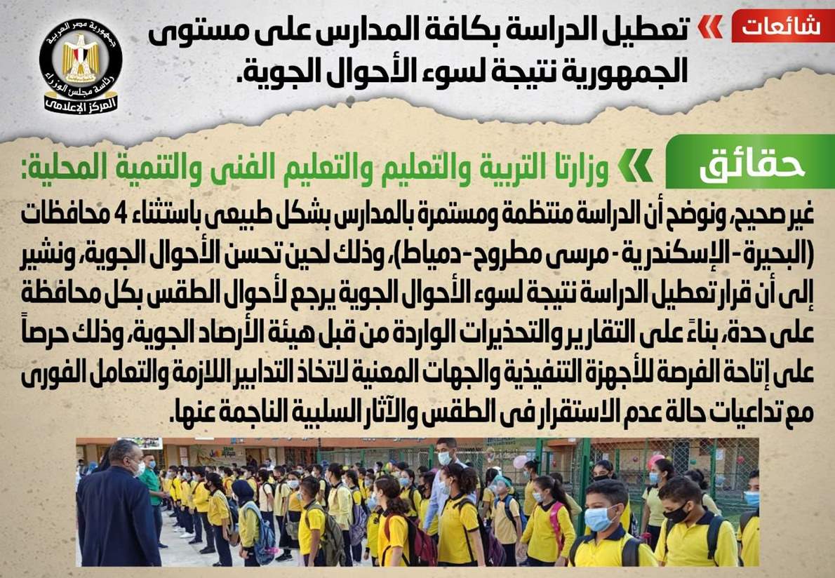 نفى المركز الإعلامي بمجلس الوزراء ما تداولته بعض المواقع الإلكترونية وصفحات التواصل الاجتماعي من أنباء حول تعطيل الدراسة بكافة المدارس على مستوى الجمهورية نتيجة لسوء الأحوال الجوية.