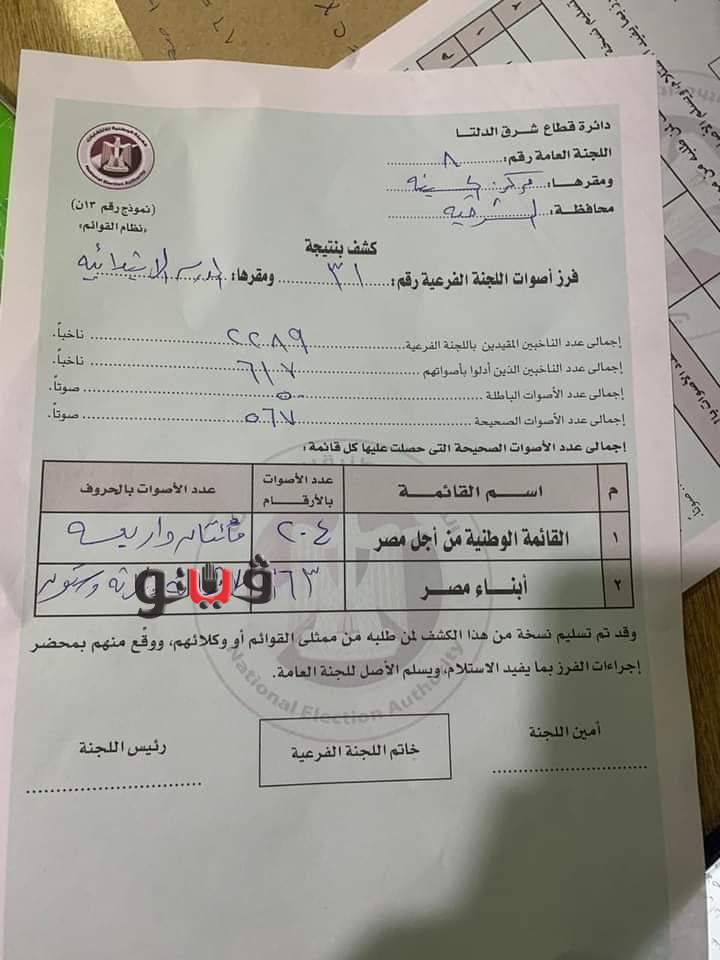 وأظهرت عمليات الفرز باللجنة الفرعية رقم 10 بمركز أول دمياط بمحافظة دمياط، الحصر العددي لأصوات القائمة الوطنية من أجل مصر بواقع 68 وقائمة تحالف أبناء مصر بواقع 328.